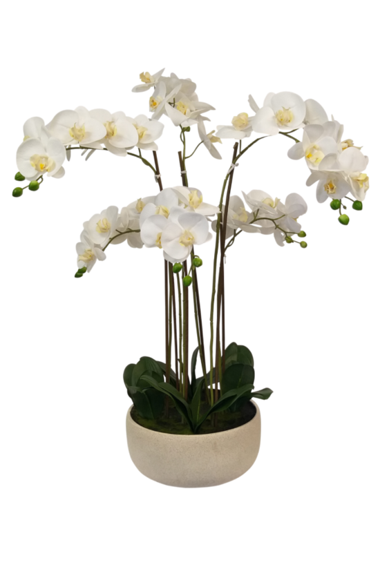 Elevate your home or office decor with our Low Dish Real Touch Potted Orchid! Standing tall at 80cm, this stunning artificial plant adds a touch of elegance and beauty to any space. Our realistic design and high-quality materials create a lifelike appearance that will impress all who see it. Say goodbye to maintenance and hello to everlasting beauty!