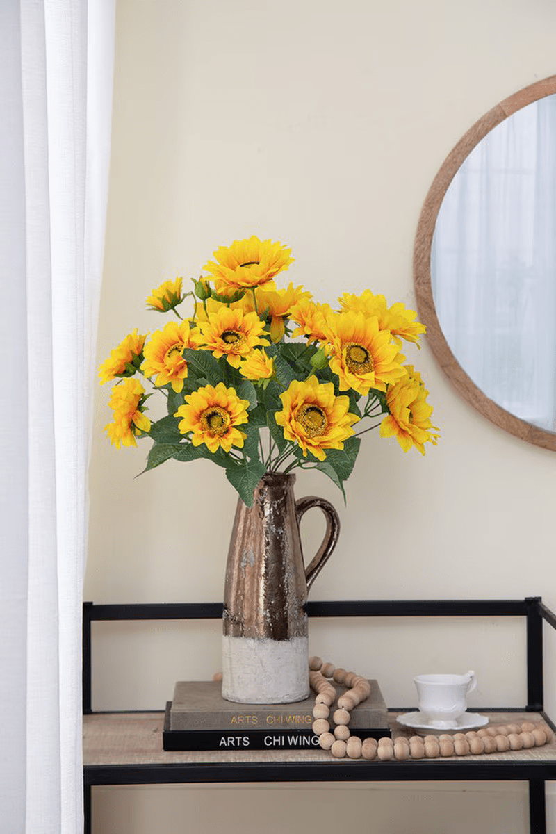 Enhance your floral arrangements and home decor with our Yellow Sunflower Stems. Each stem features vibrant, lifelike blooms and luscious green leaves, adding a touch of warmth and natural beauty. Bring the outdoors in with these cheerful and realistic flowers.