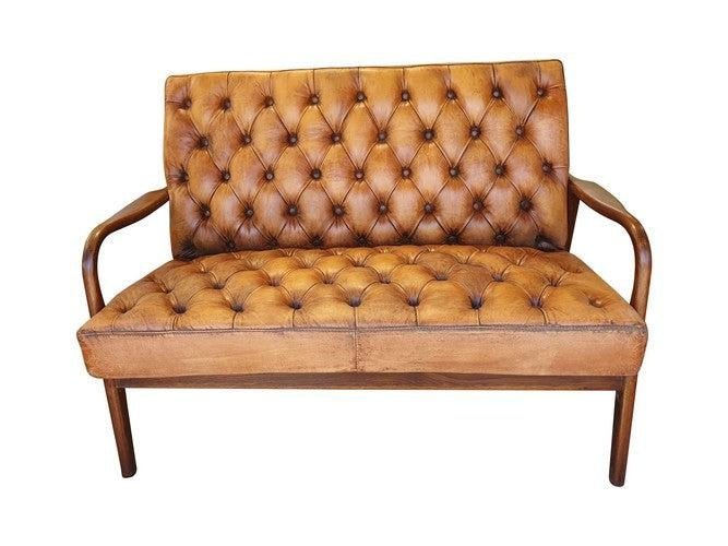 Handcrafted with exquisite finesse and polished to perfection from the finest grade of leather, this traditional button-backed settee lends an aura of sophistication and timeless luxury to any living, office, or entertainment space. Its sleek and refined silhouette, earthy tones, and cozy comfort exude a timeless elegance that will be the envy of all.