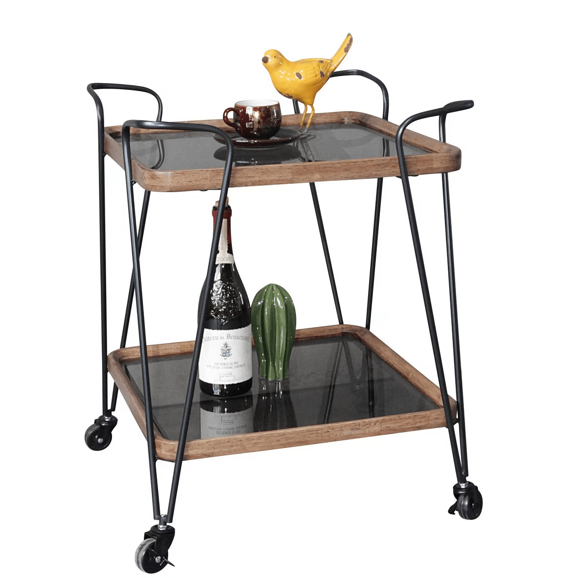 Elevate your entertaining with the Baxton Square Bar Cart Trolley. With a stylish blend of wood, metal, and grey glass shelves, this modern cart adds sophistication to any space. Durable and functional, it effortlessly serves drinks and displays your favorite bottles and glassware. Its smooth-rolling casters make it a versatile addition to your home.