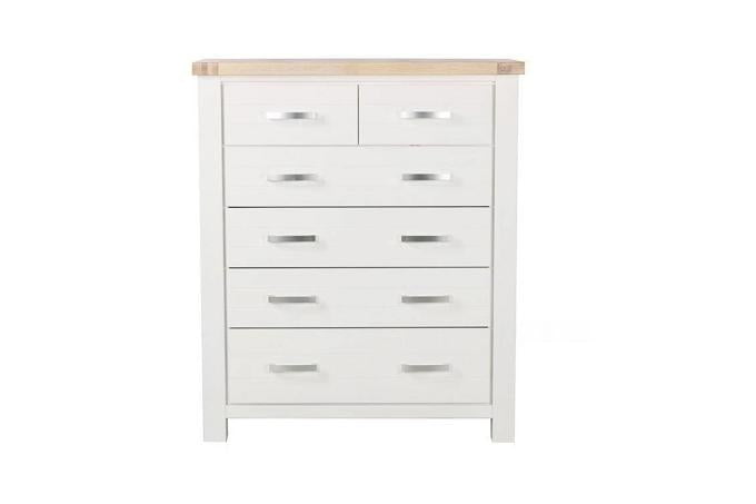 The range utilizes solid timber: Acacia is the white painted wood, with light ash timber for effect. All items are solid built and use polished silvery handles on all drawers.