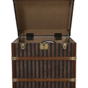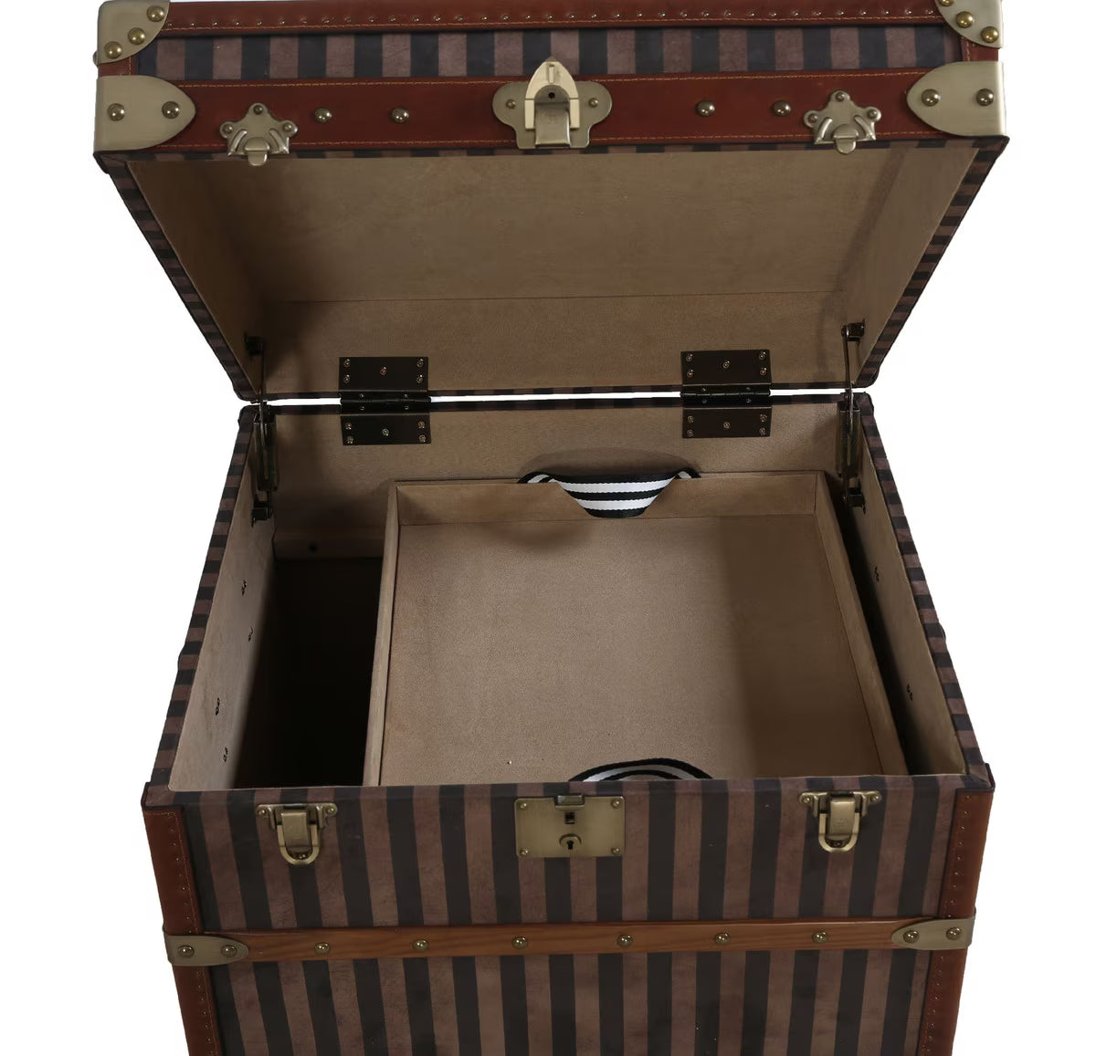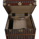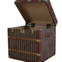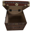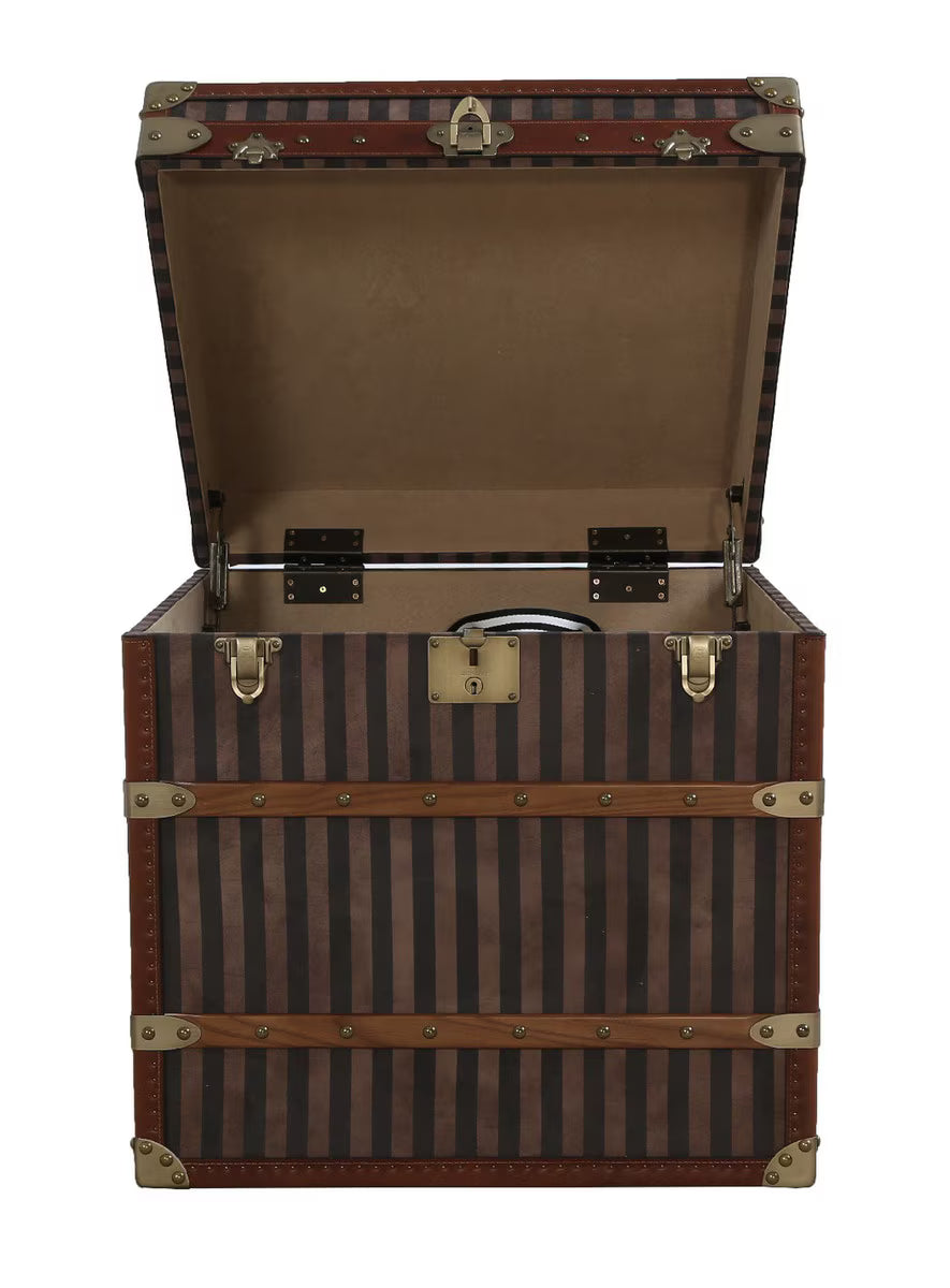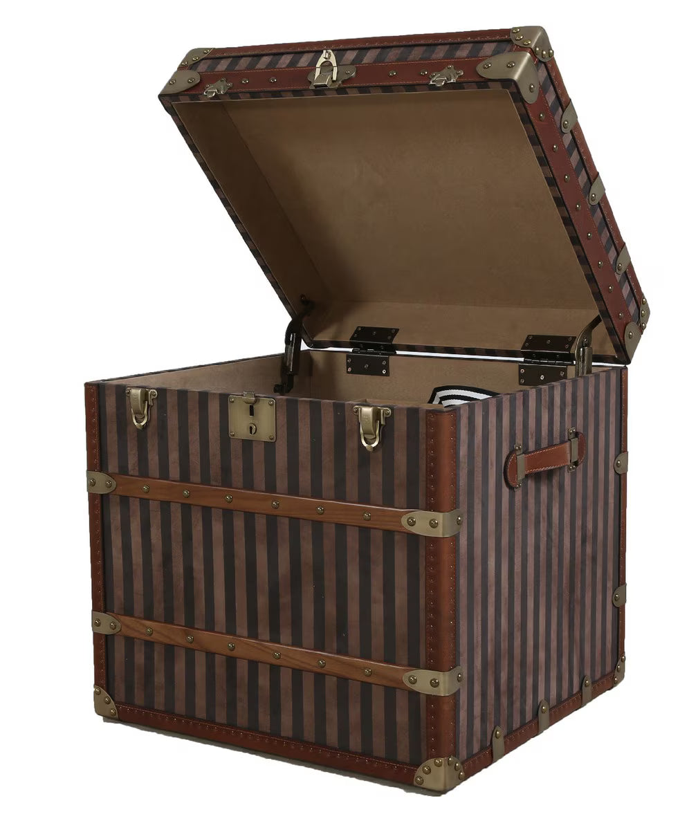Add a touch of vintage charm and practical storage to your home with this beautifully crafted courier trunk. Designed with a striking red and beige striped canvas exterior, it captures the timeless appeal of classic travel trunks while offering modern functionality.