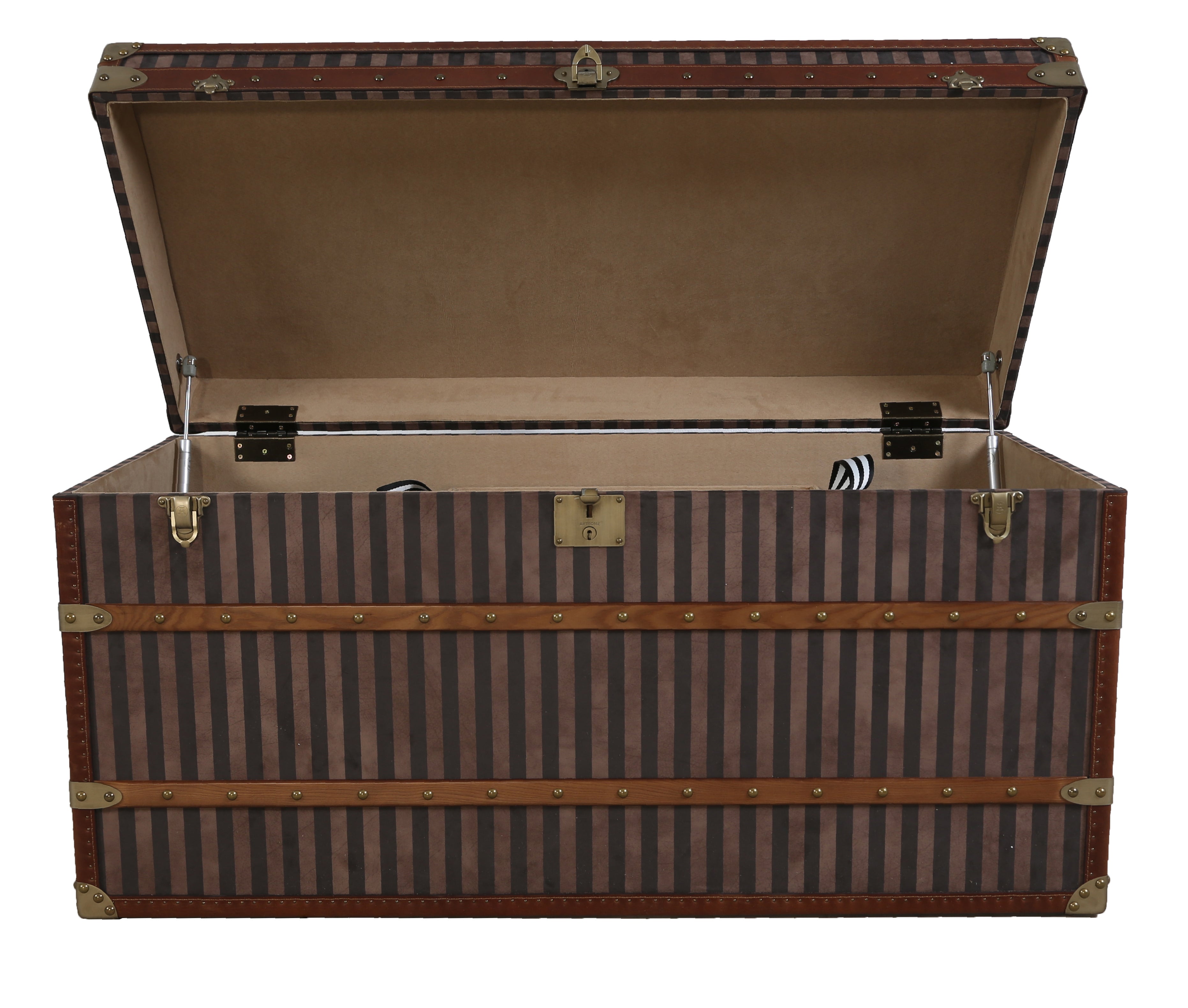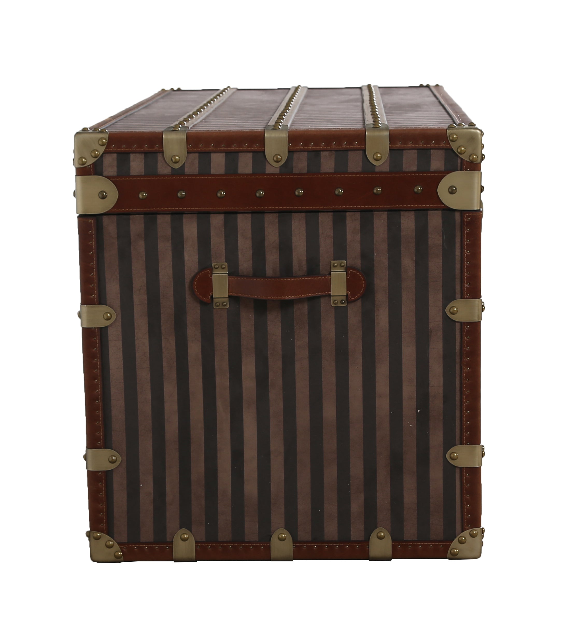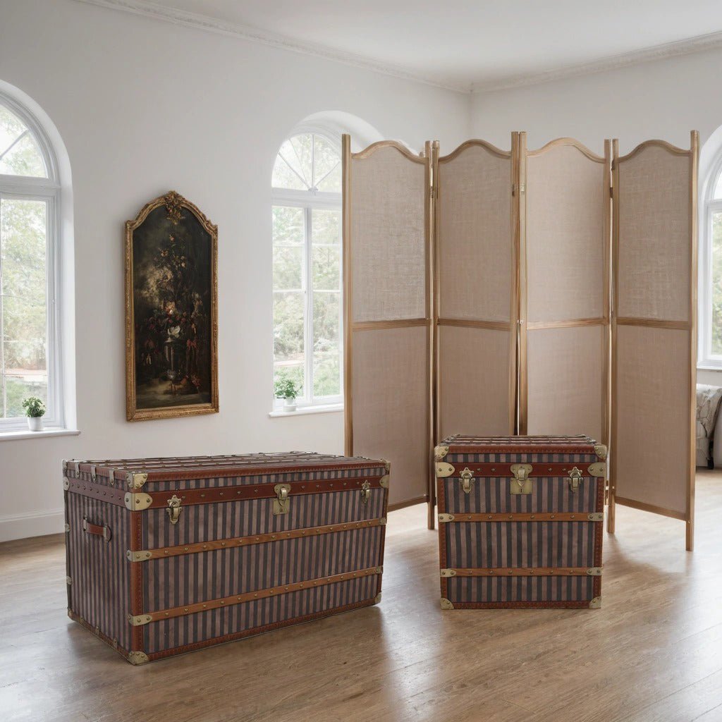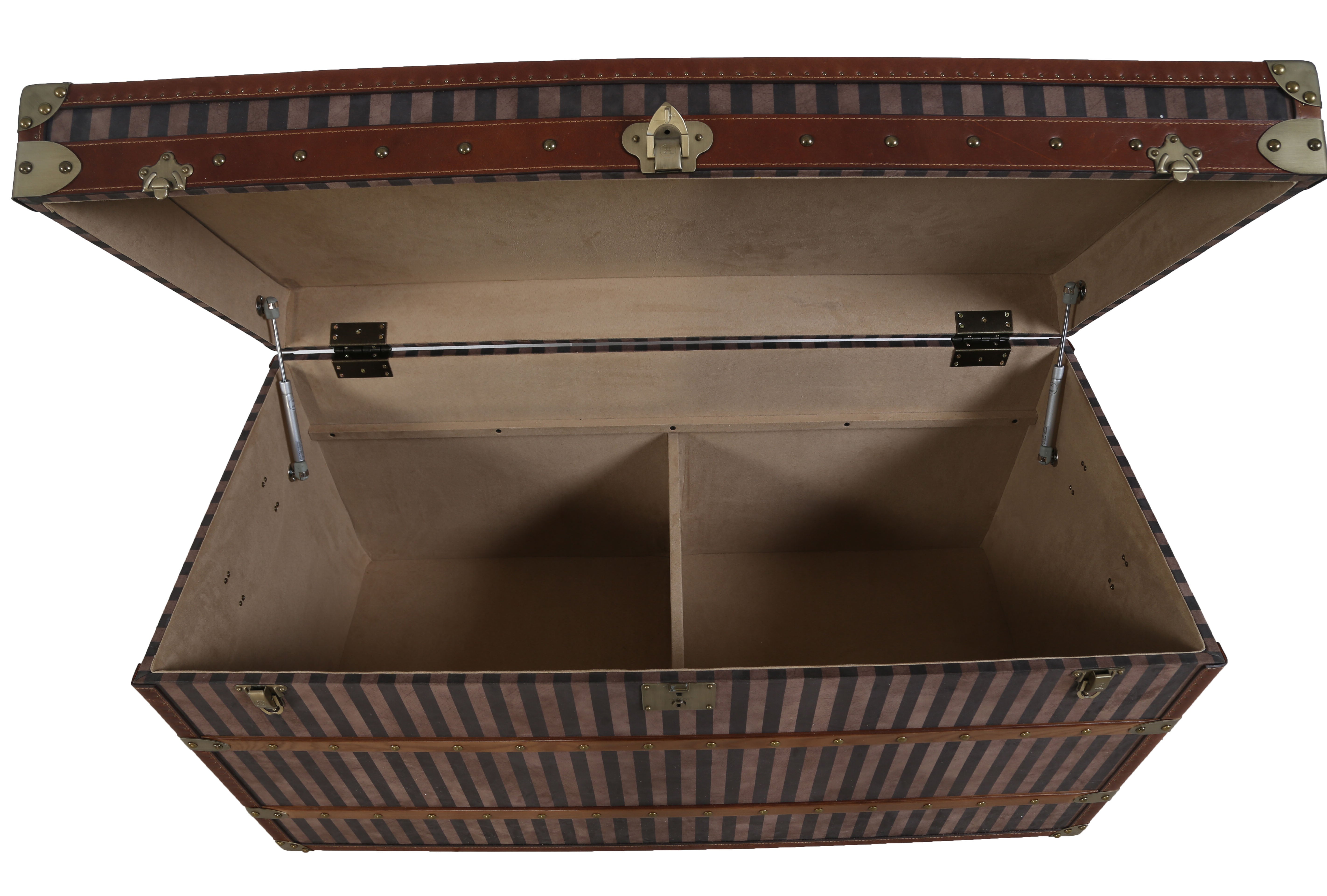 Add a touch of vintage charm and practical storage to your home with this beautifully crafted courier trunk. Designed with a striking red and beige striped canvas exterior, it captures the timeless appeal of classic travel trunks while offering modern functionality.