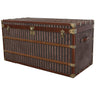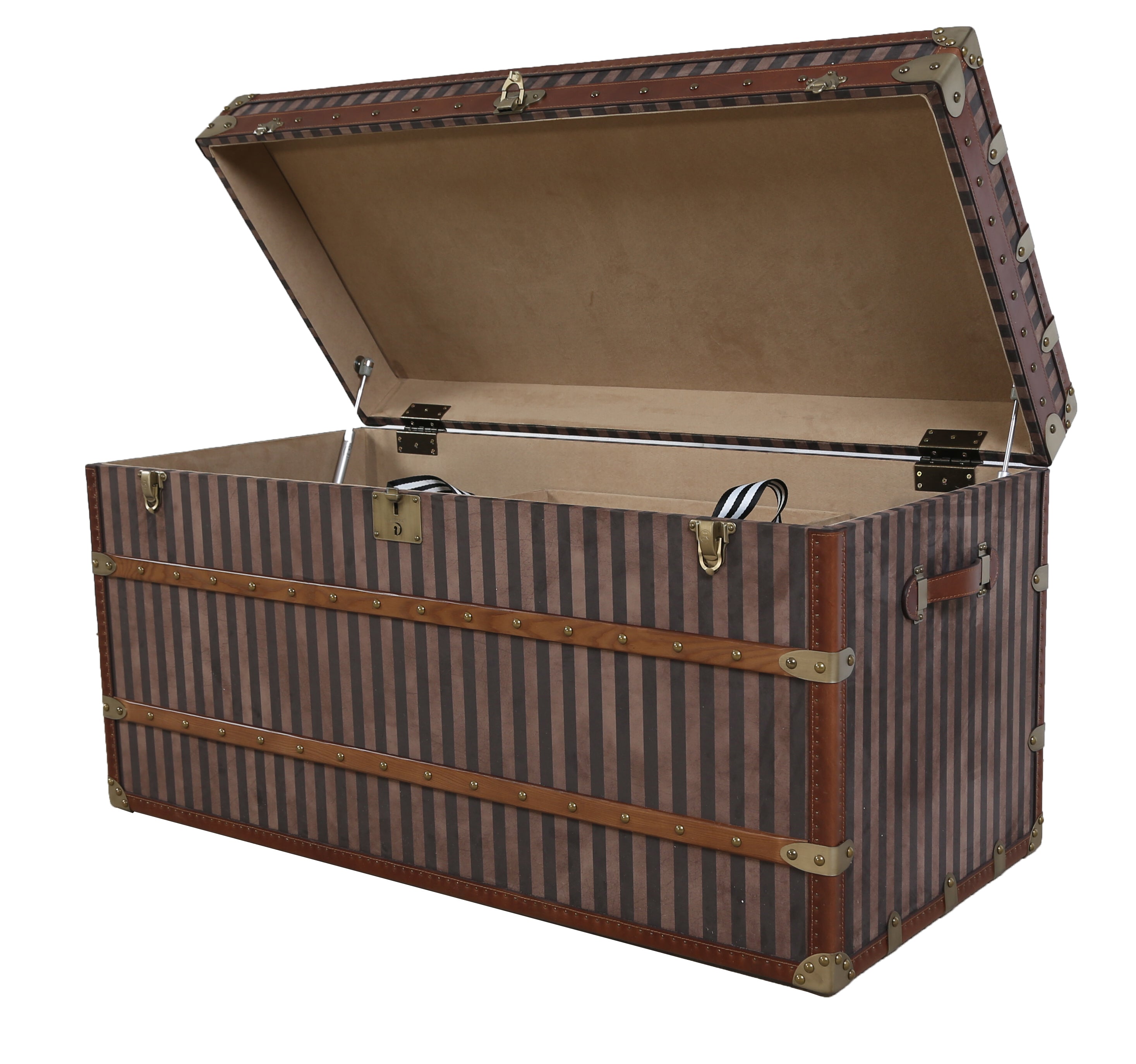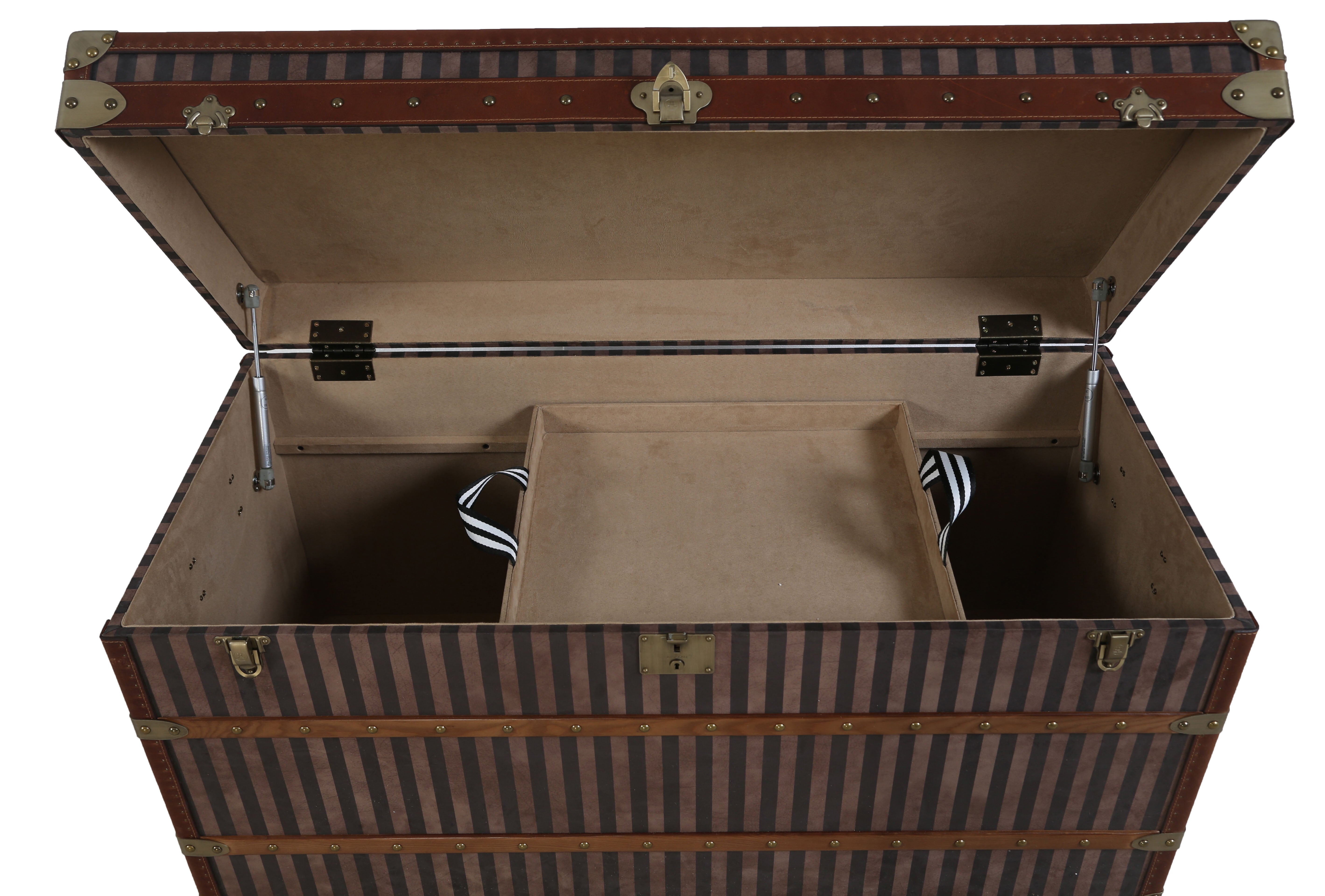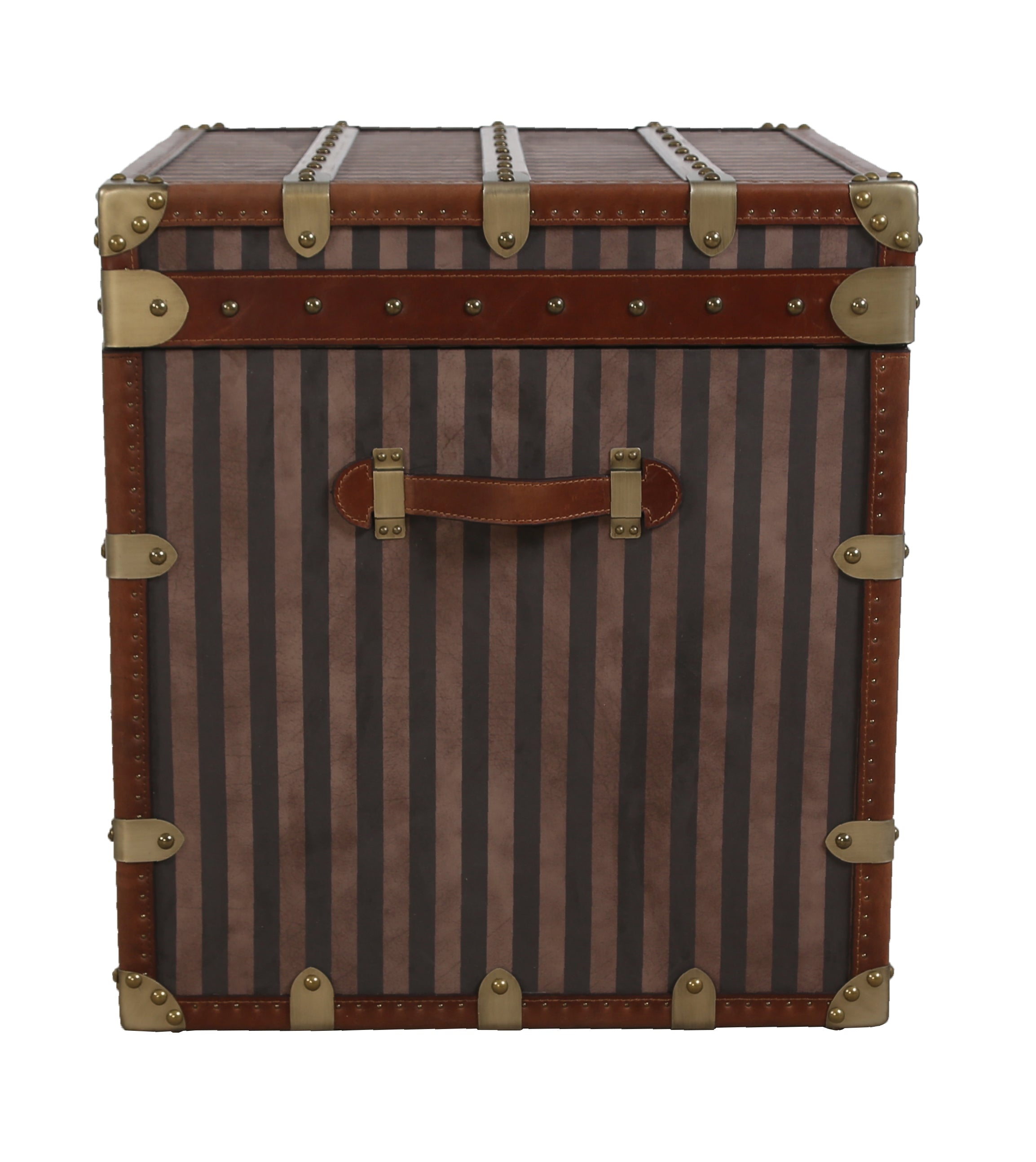 Add a touch of vintage charm and practical storage to your home with this beautifully crafted courier trunk. Designed with a striking red and beige striped canvas exterior, it captures the timeless appeal of classic travel trunks while offering modern functionality.