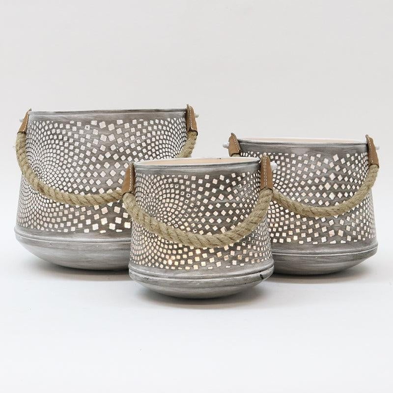 Discover contemporary elegance with the Lantern Dubai large. Featuring a bold, grey and white colour palette, this captivating lantern is an eye-catching addition to any décor. Its riveting combination of metal, rope, and leather offers a unique texture and look that will create a stunning atmosphere in any room.
