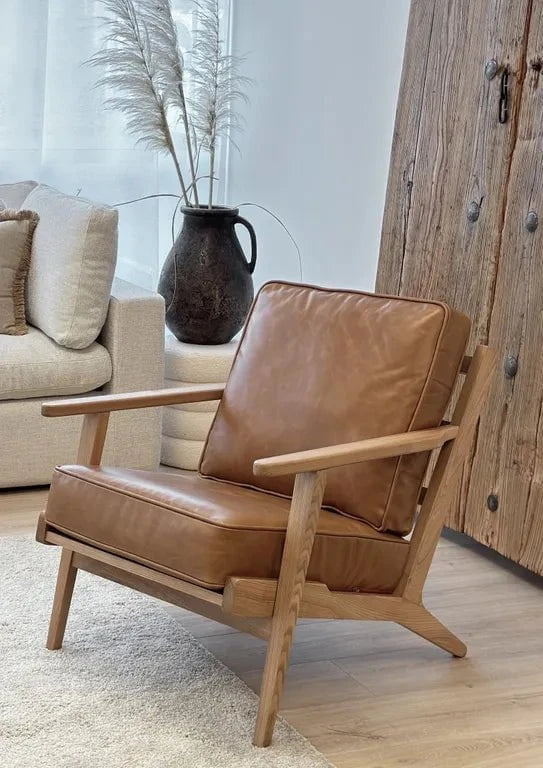 Invoke a relaxed atmosphere and classic styling with our Lodge Armchair. Its solid oak frame is designed with nonchalant grace, supplying you with a supremely cozy reclined position. And the deep padding offers a delightful "sink-in" sensation. An ideal choice for any room in your home.