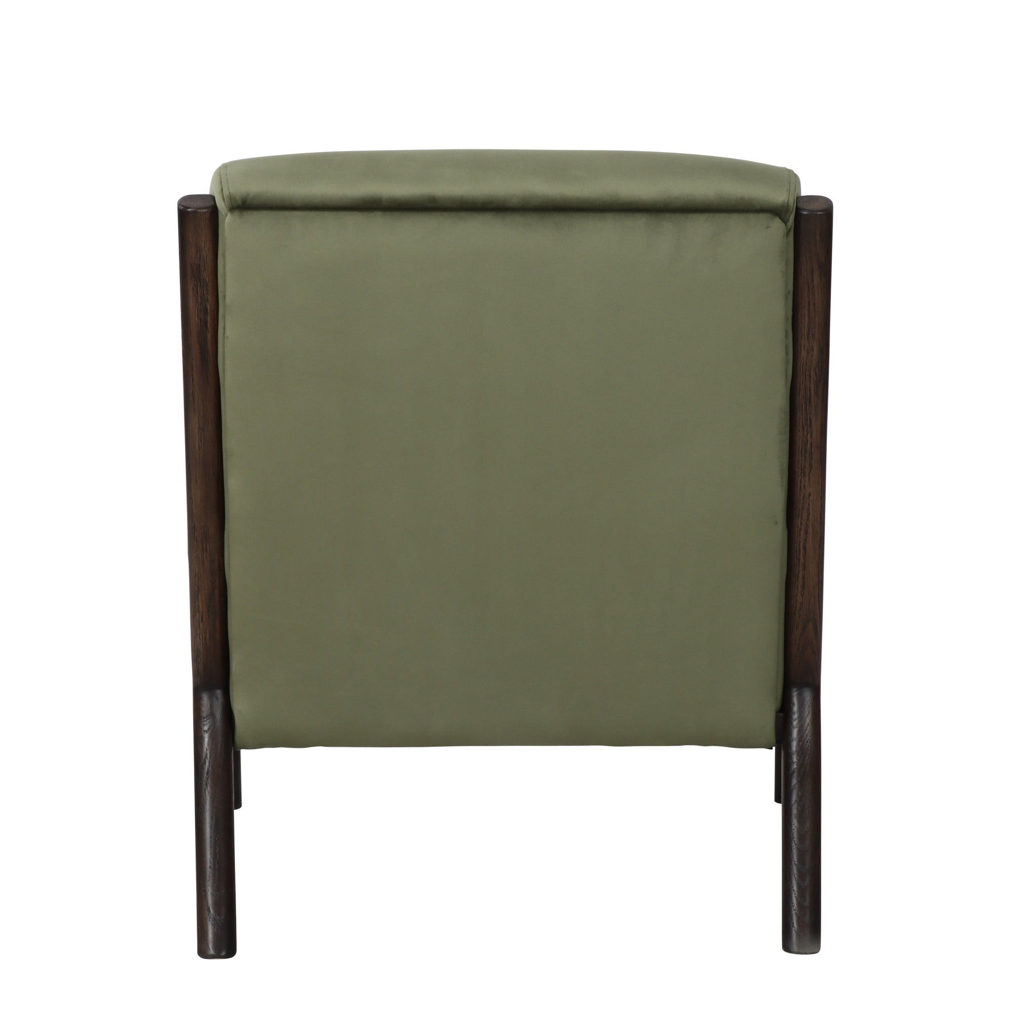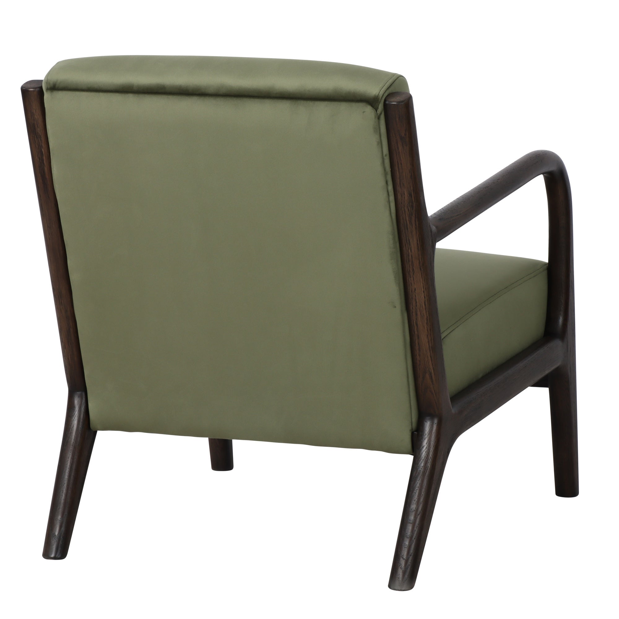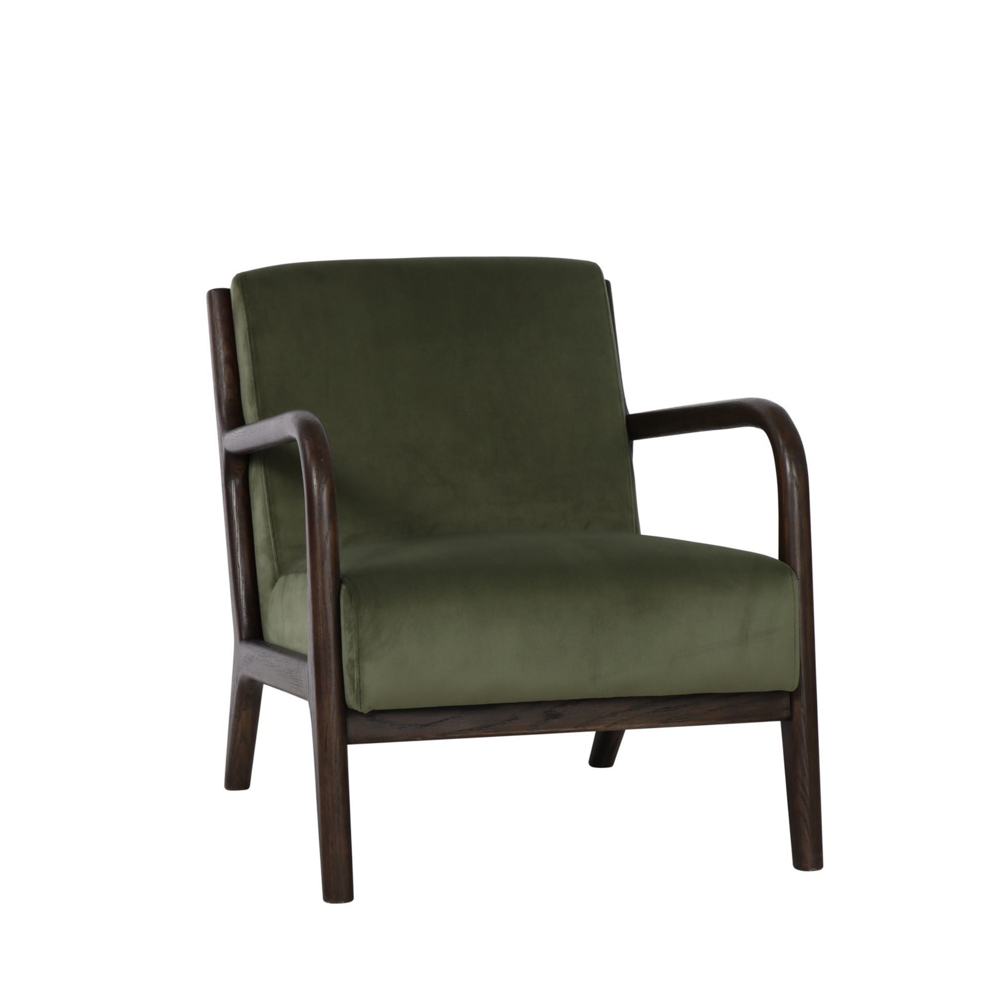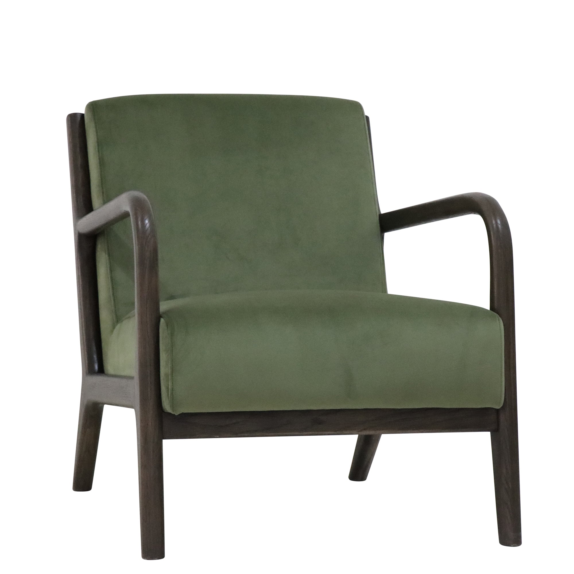The Renfrow Armchair in Olive Velvet embodies timeless mid-century modern elegance. Its rounded Oak frame, finished in rich dark chocolate stain, creates a sophisticated silhouette that complements the sumptuous velvet upholstery.