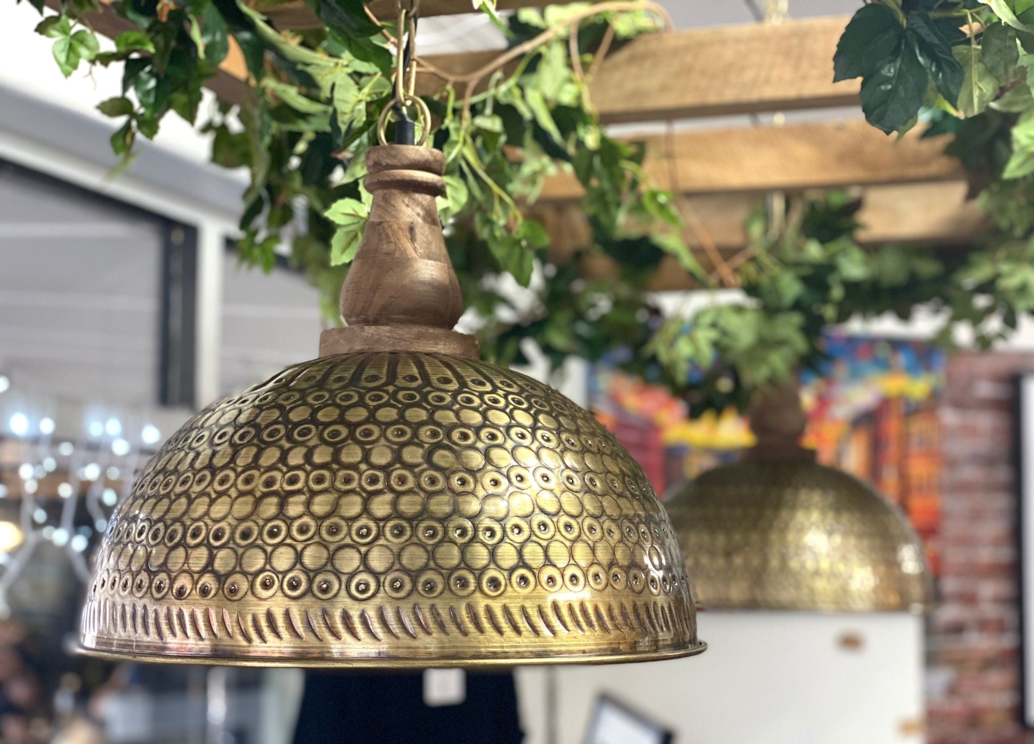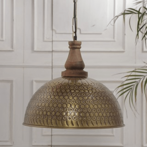 The Sefrou Brass Hanging Light brings warmth and elegance to any room with its golden hue and sophisticated blend of brass and wood materials. Illuminate your space with beauty and style.