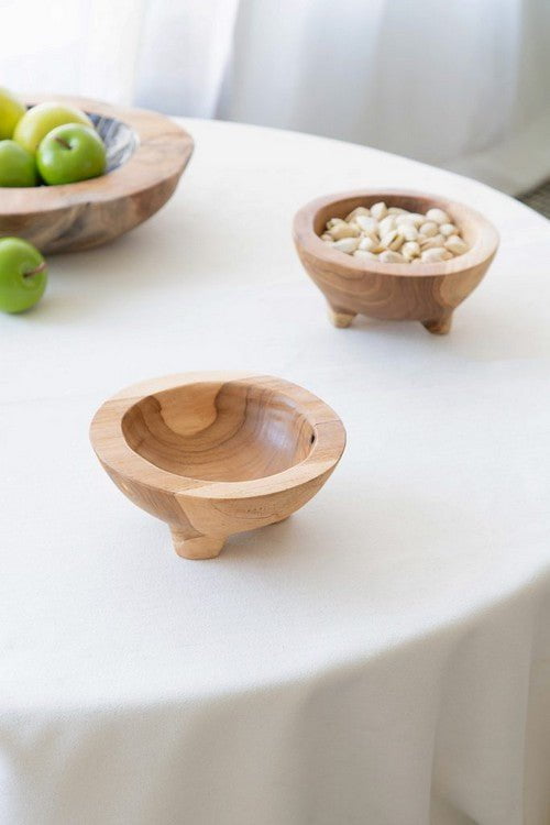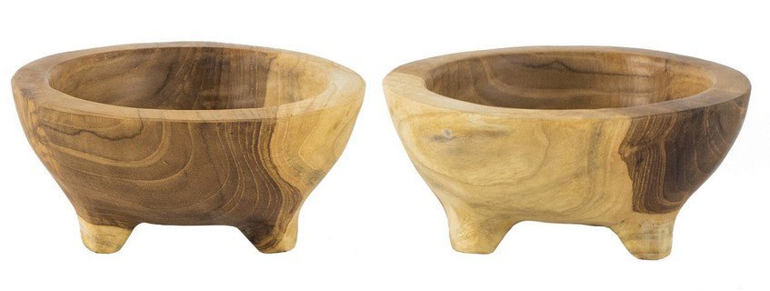 This set of two teak bowls with legs add a natural yet elegant element to decor. Each petite bowl is carved out of a single piece of genuine teak wood, revealing the material’s distinctive grain and warm tone. Use on an entryway table or on the top of a dresser as a decorative catch-all.