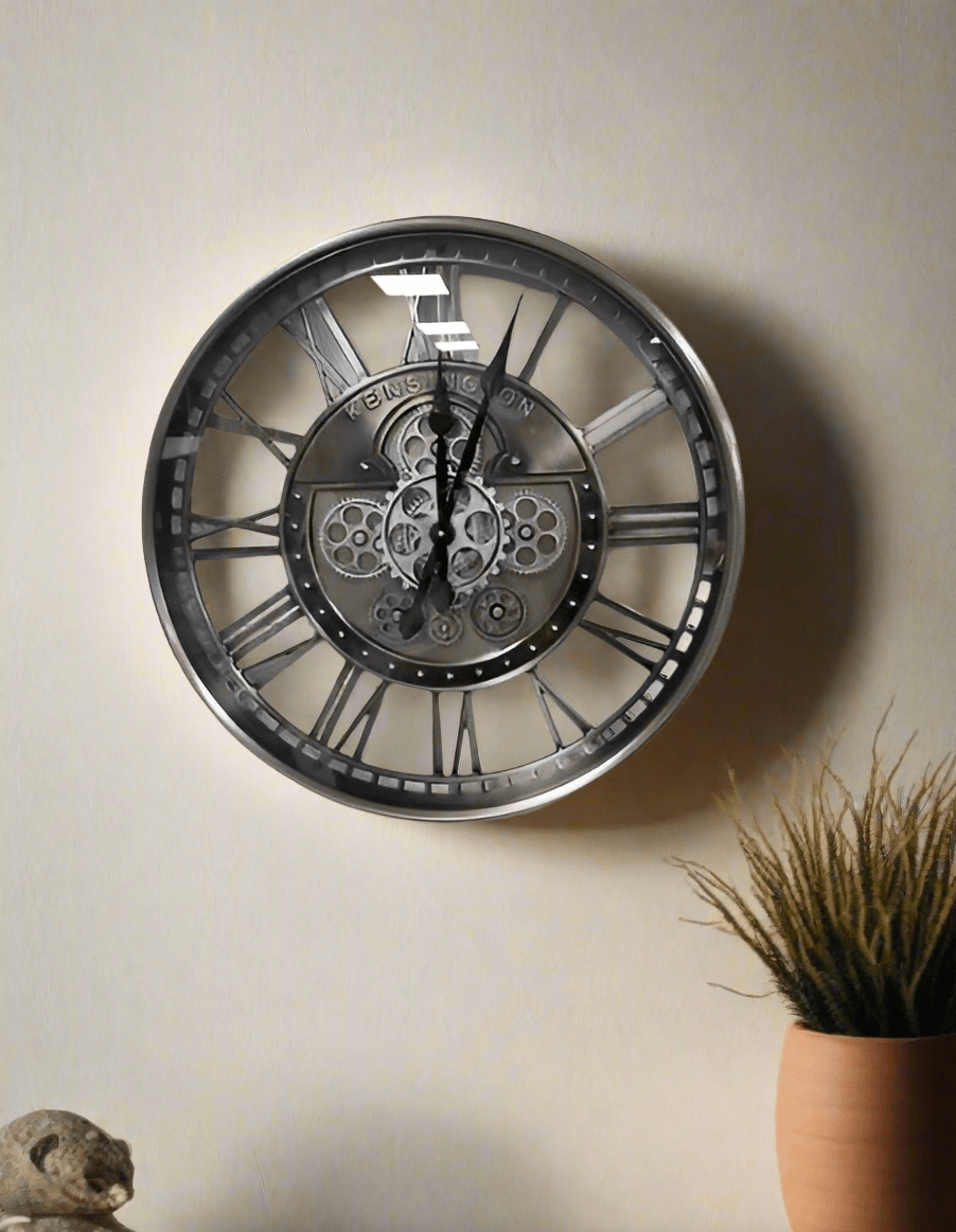 This antique silver gear clock is a stunning piece of functional art crafted from metal. It features an intricate design of carefully placed gears that give it a unique look. The clock is an ideal wall décor item, turning any space into a stylish and eye-catching room. With accurate time-telling capabilities, this clock is both aesthetically pleasing and perfectly efficient.
