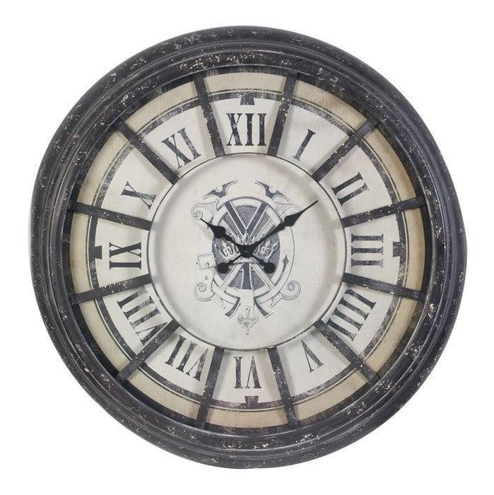 With its distressed, antique Gray finish, bold roman numerals, and regal-looking crest.