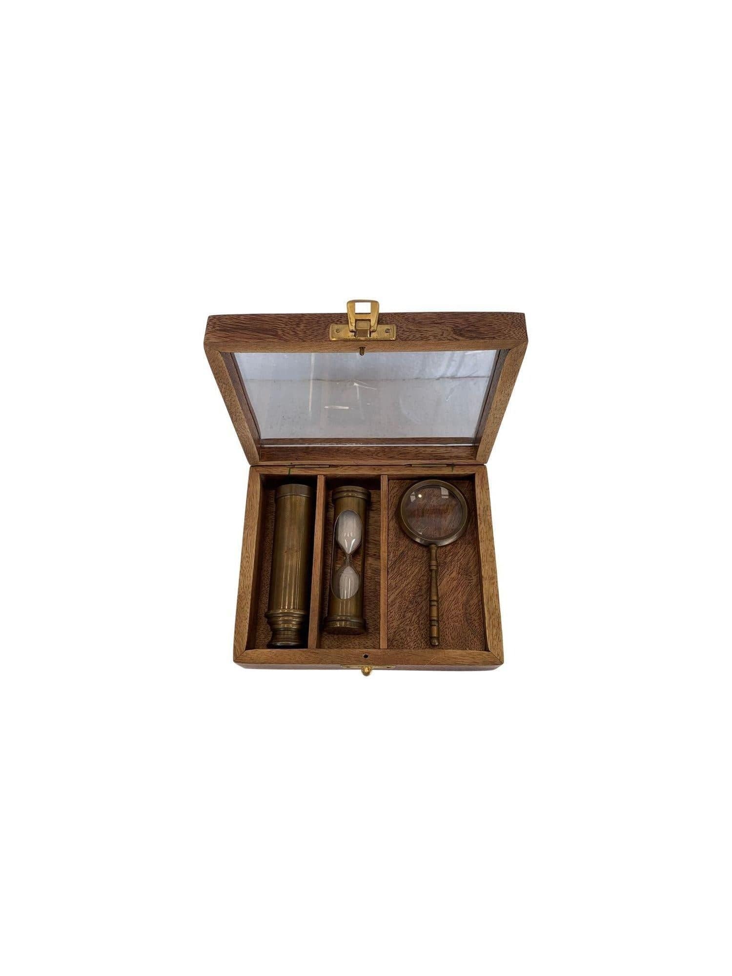 Introducing our timeless Sand Timer, Telescope and Magnifier Set: a 3-piece set crafted from brass and wood that stimulates exploration and discovery. An eye-catching gift that will last generations, this set will help your loved one marvel at the wonders of the world. Can you imagine the possibilities?