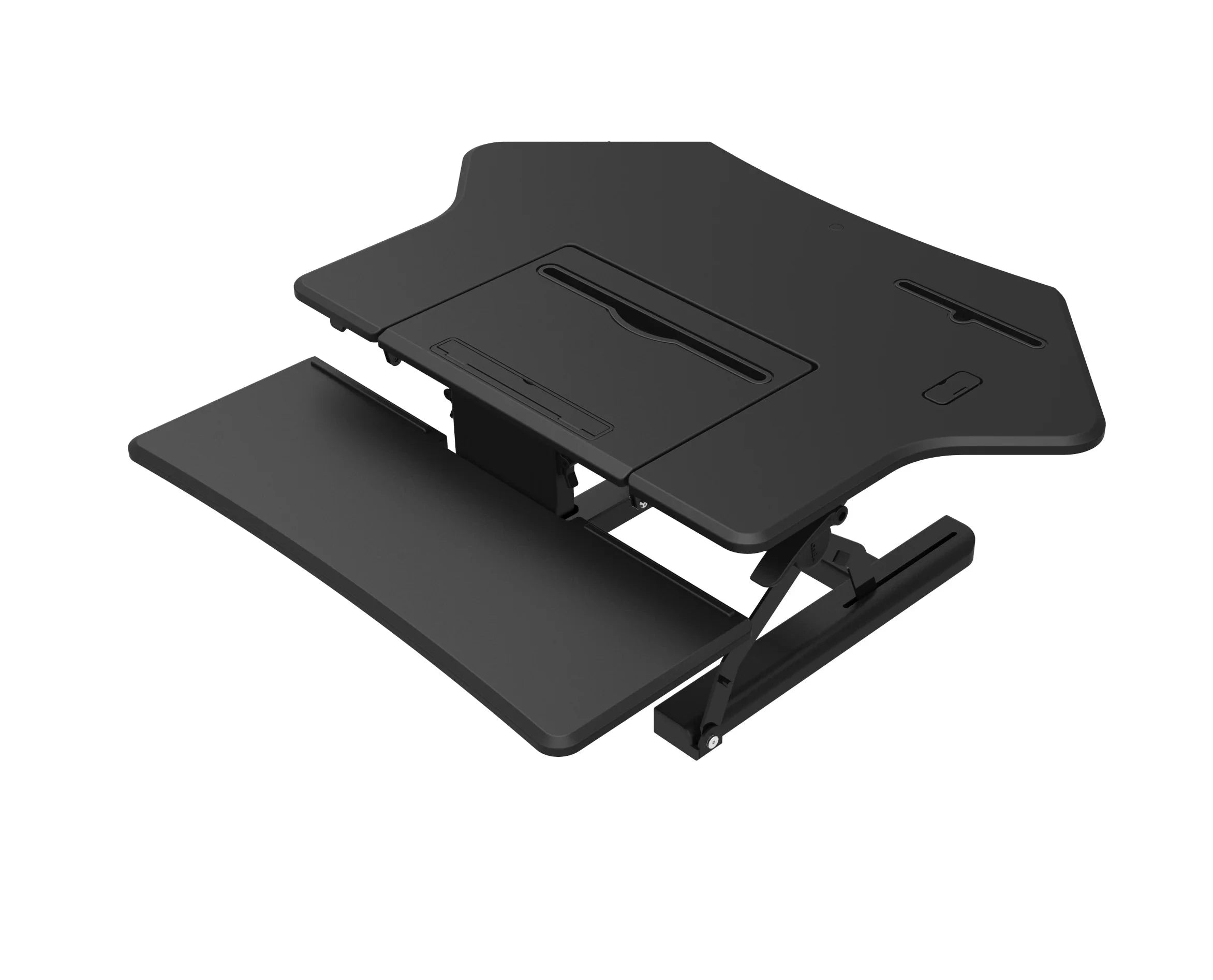 Improve your workplace health and productivity with the Arise Ergolator Corner. Unlike other desktop sit stand units, the Ergolator incorporates a drop-down keyboard platform that places your keyboard at or below desktop level. This ergonomic design helps alleviate discomfort while typing, whether sitting or standing. Additionally, the Ergolator features an in-line copyholder between the keyboard and monitor for easy document viewing. According to ergonomists, this vertical movement posture is the most efficient way to work, reducing eye, neck, and shoulder strain. Plus, the Ergolator comes equipped with two USB desktop ports for convenient access to power. Upgrade your workspace and see the benefits for yourself with the Arise Ergolator Corner.