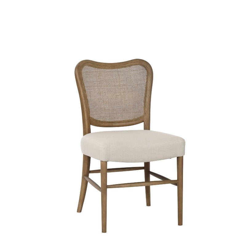 Elevate your dining experience with the Giverny Dining Chair, featuring a refined oak wood frame in natural finish complemented by cream linen upholstery. The distinctive rattan back adds textural interest while maintaining a light, airy aesthetic. This sophisticated seating option seamlessly blends timeless craftsmanship with contemporary comfort for discerning interiors.