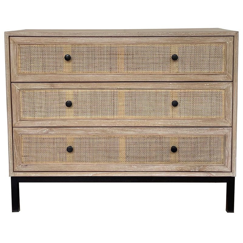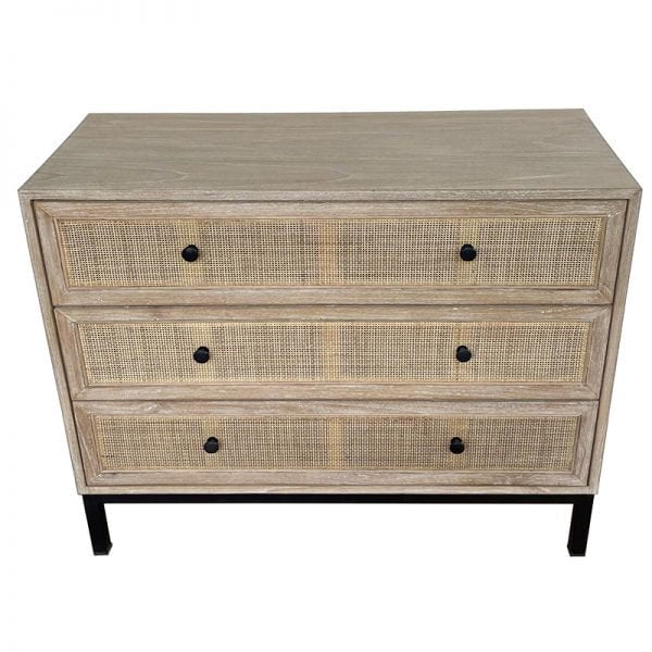 Introducing the Cardrona Commode, a stunning addition to any space. Featuring three spacious drawers and a beautiful natural rattan finish, this piece is not only functional but also adds a touch of style to your home. Made with a durable and stylish combination of iron, Bayur, MDF, Mindi Veneer, and woven rattan. Elevate your living space with the Cardrona Commode today!