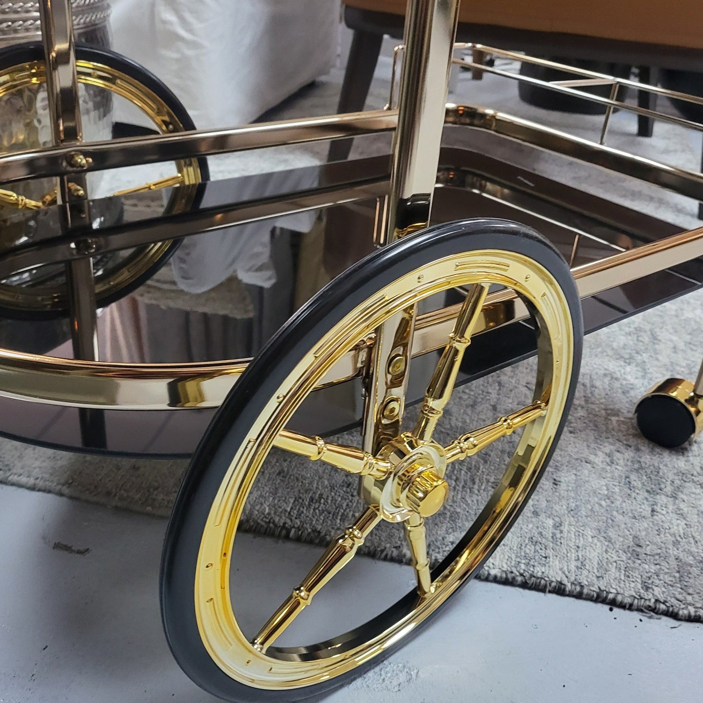 Bring elegance and sophistication to any room with the Drinks Trolley - Gold! Crafted with stunning black glass and chrome metal, this trolley features a glittering gold frame and big wheels. Serving drinks has never been so glamorous - get yours now and enjoy a touch of luxury in your home.
