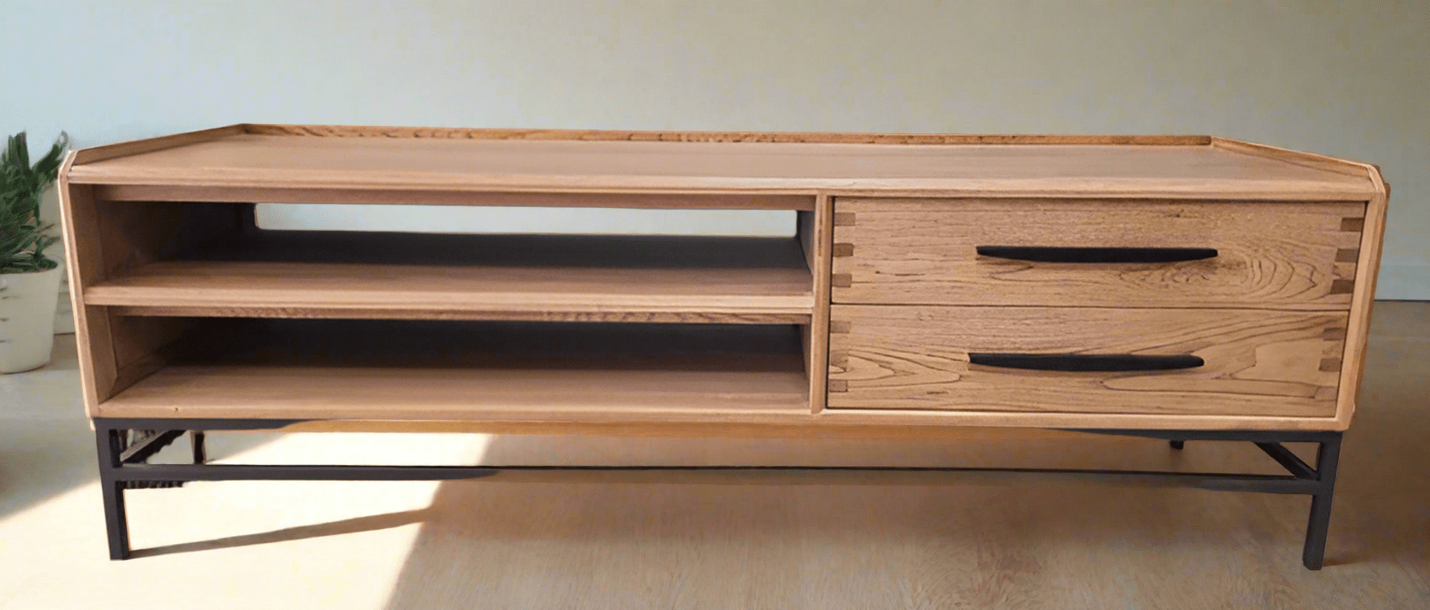 Introducing the Carlton Entertainment Unit in natural oak. Made from high-quality oak and iron legs, this unit adds a touch of elegance to any room. Organize your entertainment essentials while adding a beautiful piece of furniture to your home. Upgrade your space with the Carlton Entertainment Unit today!