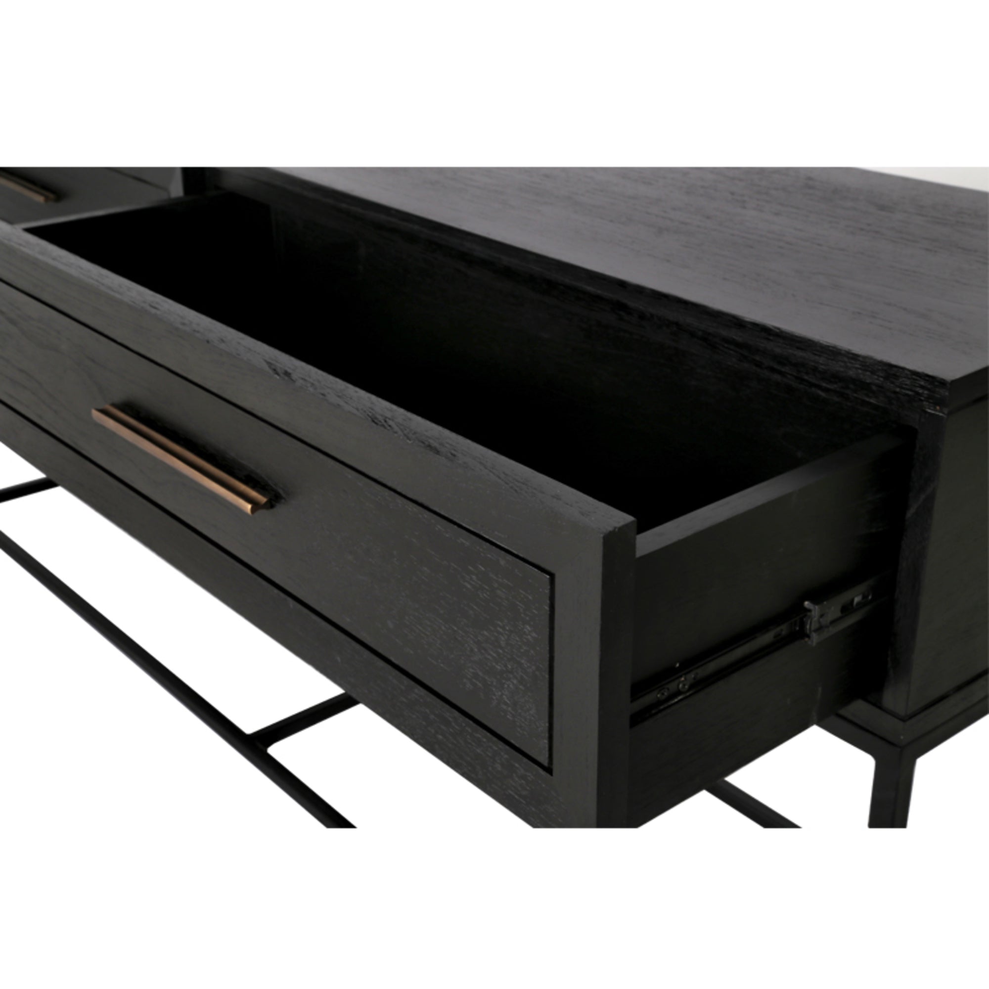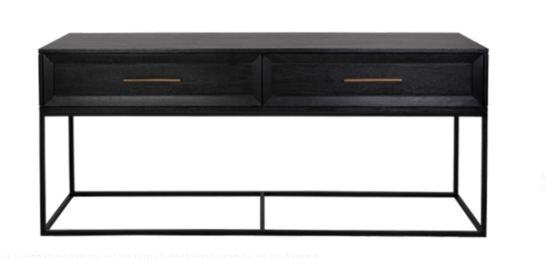 Complete your home with the chic Chicago Console Grande. Crafted with luxurious white cedar wood and veneer finished in black, this elegant console is enhanced with brass handles, iron, and metal runners for a sophisticated, modern style that will elevate any room.