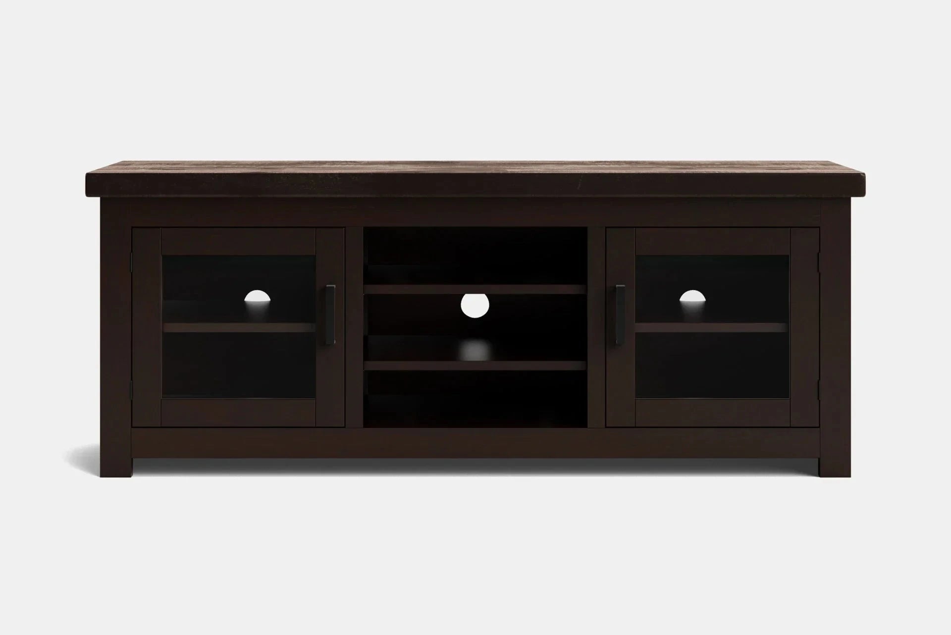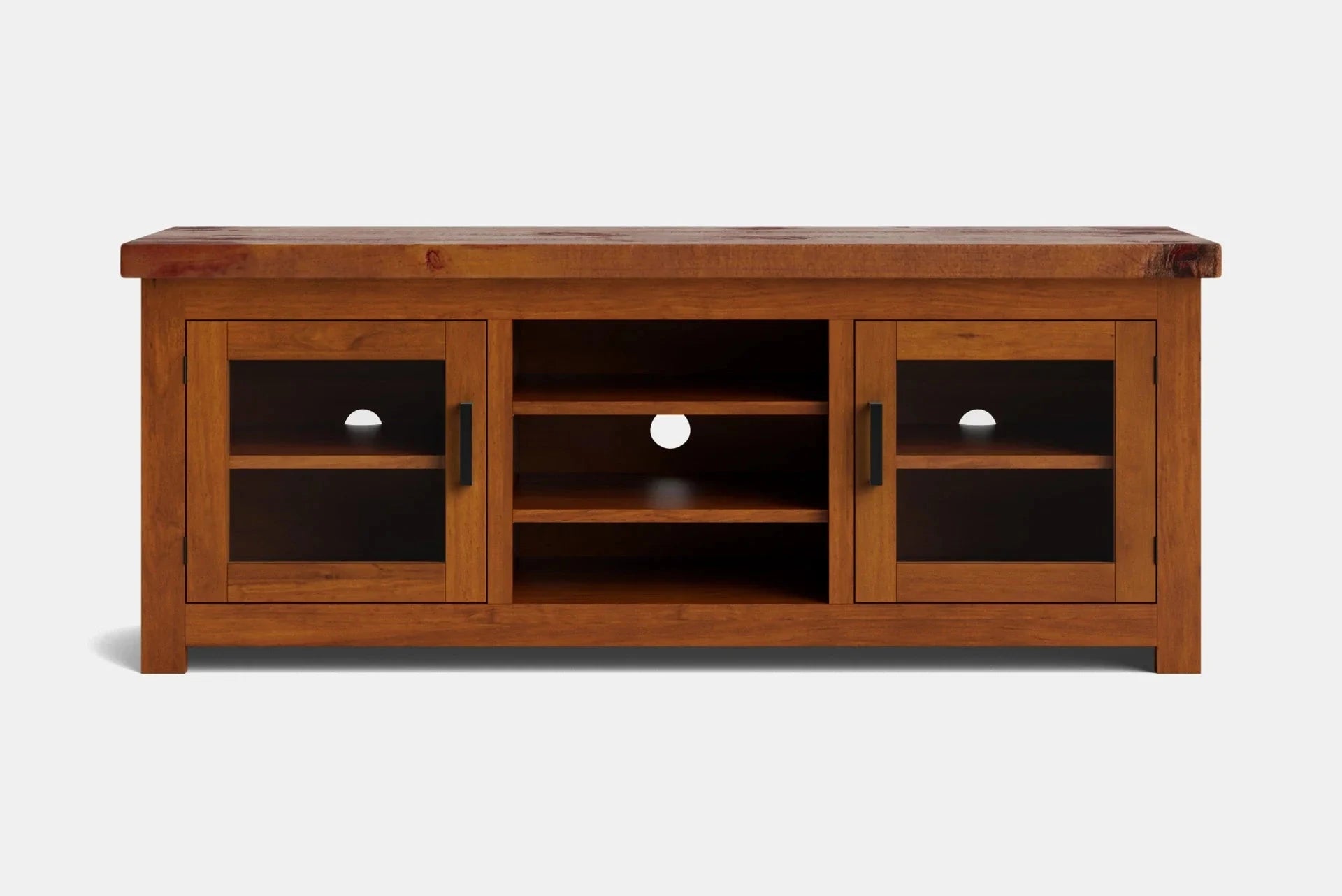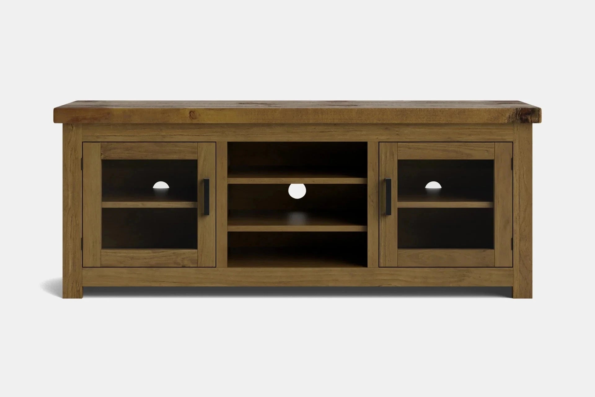 Create a stylish and functional entertainment space with the Marlborough Entertainment Unit. Featuring a rustic roughsawn pine top and tinted glass doors, this unit can fit in with both modern and rustic styles. Two open shelves offer storage for all your entertainment needs as well as two cupboards which can hide messier items. Relax on the couch as the low height will hold a screen at eye level for best viewing.