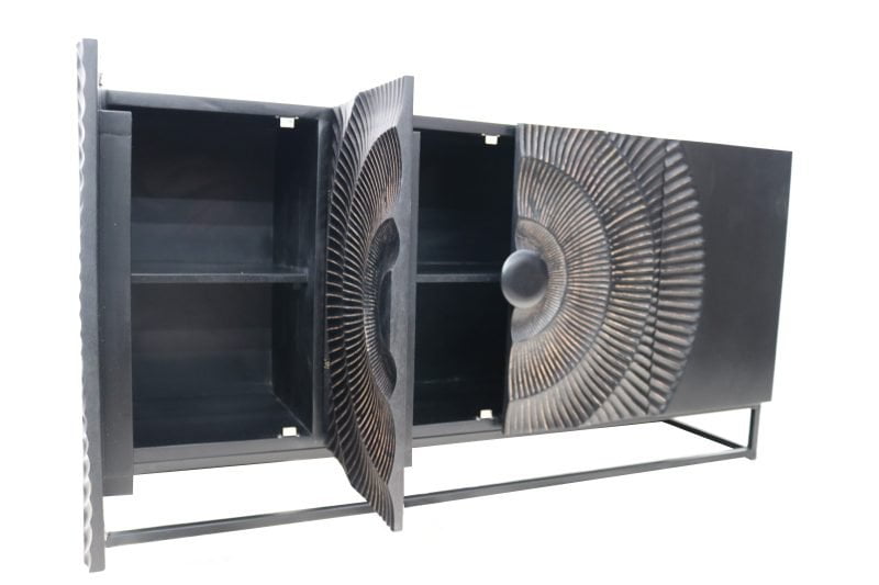 The Hype Sideboard 150cm is made of mango wood and black powder coated iron for a durable, modern look. Its color is a sophisticated black to complement any contemporary décor. Its generous size and spacious drawers provide ample storage for the home.