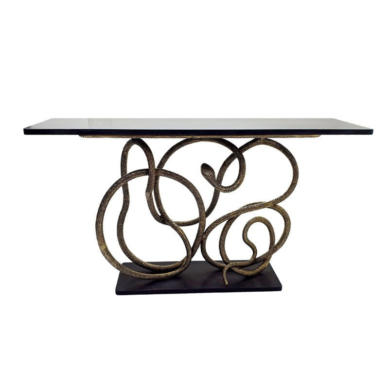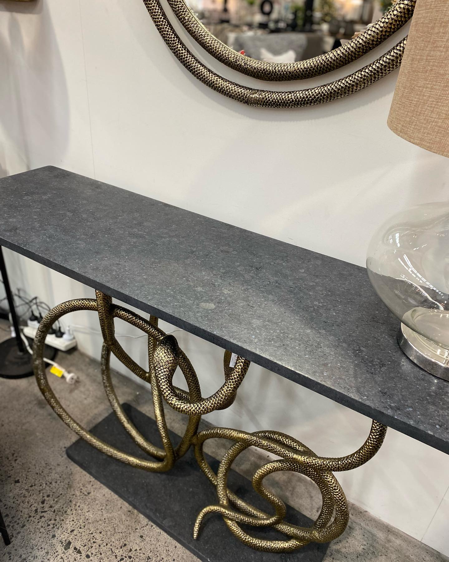 Experience luxury with the Snake Console Table - a true conversation starter. With an antique brass and black granite finish, this aluminium and granite table combines sophistication and durability for a classic piece that will last for many years to come. Make an unforgettable statement and instantly upgrade any room.