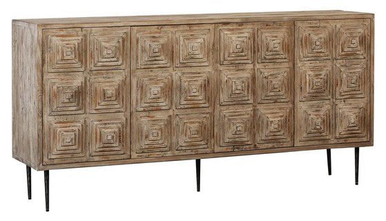 A rustic sensibility is paired with intriguing, hand-carved embellishments in this striking sideboard. The Tempt Sideboard has visual appeal with its geometrical four front doors. The fir wood has been finished with an old wood shade giving the Tempt a well-loved, antique feel.