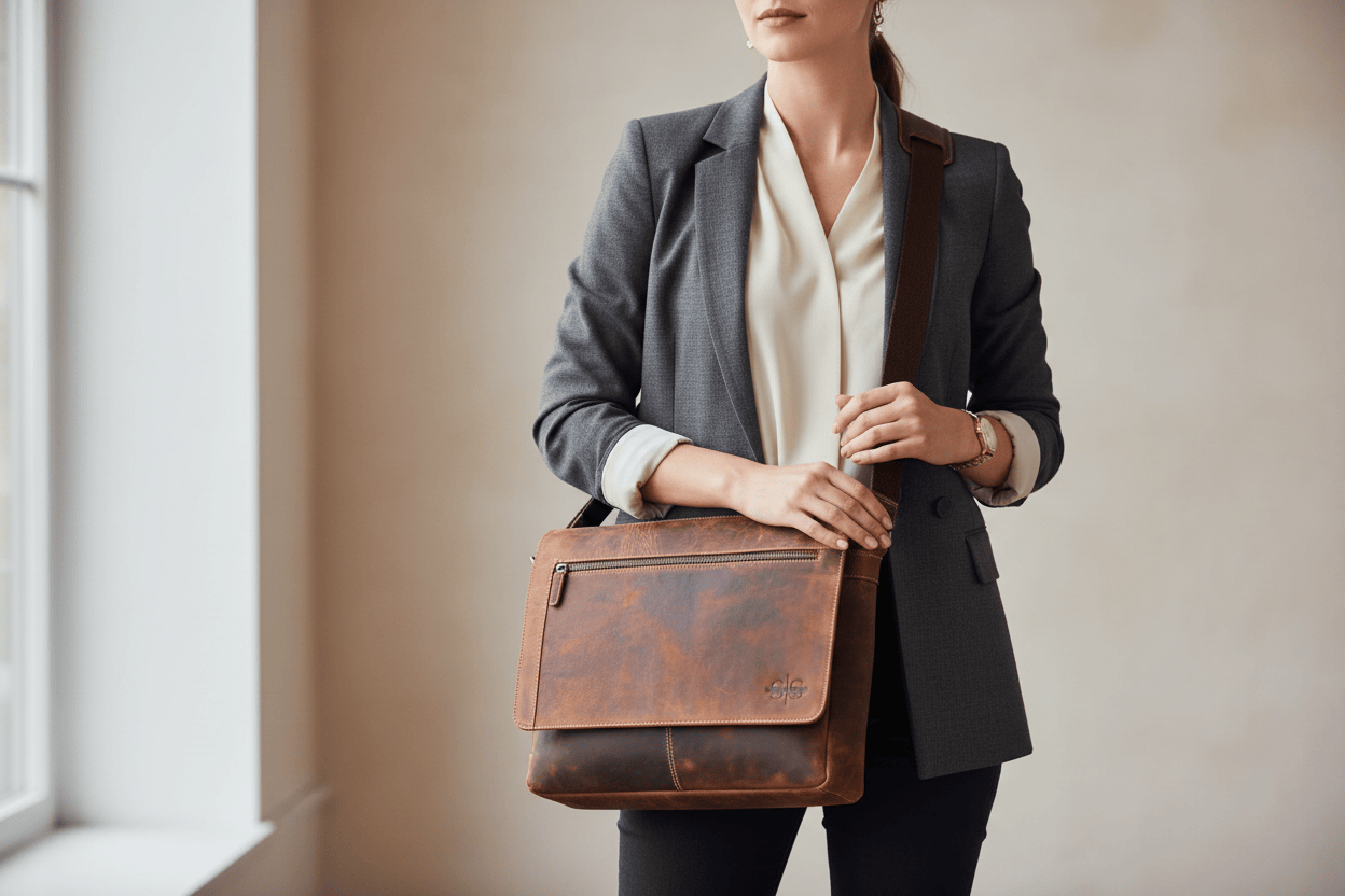 This laptop bag offers a refined design with a secure closure using two magnetic buttons, complemented by a zippered main compartment. Inside, you'll find convenient slit pockets alongside a small zippered pocket for safeguarding valuables. The front features an open pocket, while zippered compartments are available on both the front and back. The adjustable cotton shoulder strap, enhanced with leather trim, ensures comfort and elegance for everyday use.