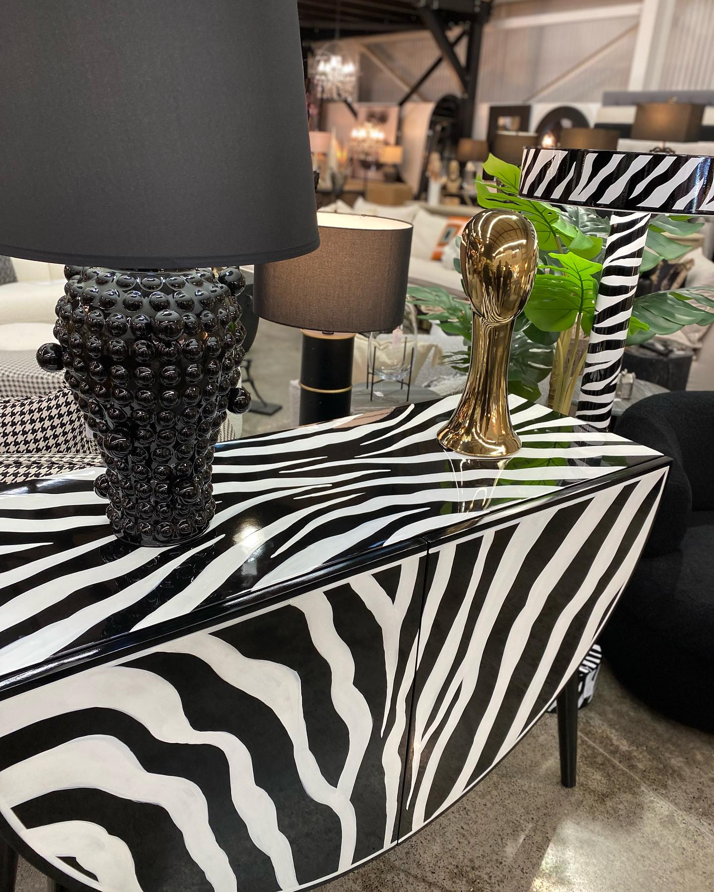 The Zebra Sideboard is a striking piece of statement furniture! Its modern zebra print design is hand-painted on MDF and supported by solid birch legs. Give your home an exciting look with this eye-catching piece that's sure to become a conversation starter.