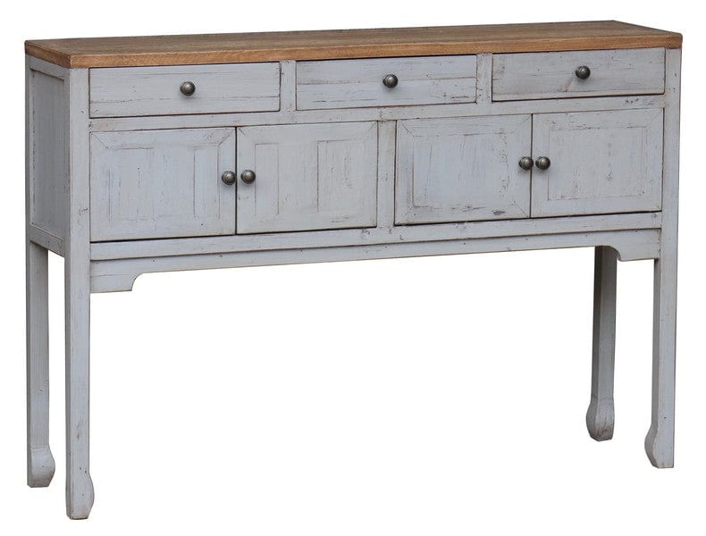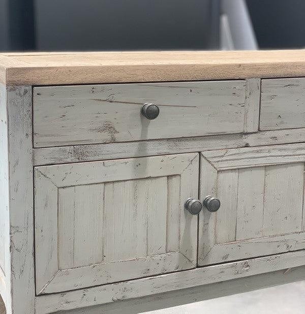 This timeless 3 Drawer, 4 Door Console flaunts a distressed grey base for an understated vintage vibe. Crafted from hardy pine, with a natural oak top, this console is built to last and perfect for hallways or living spaces, adding storage and style in one go!