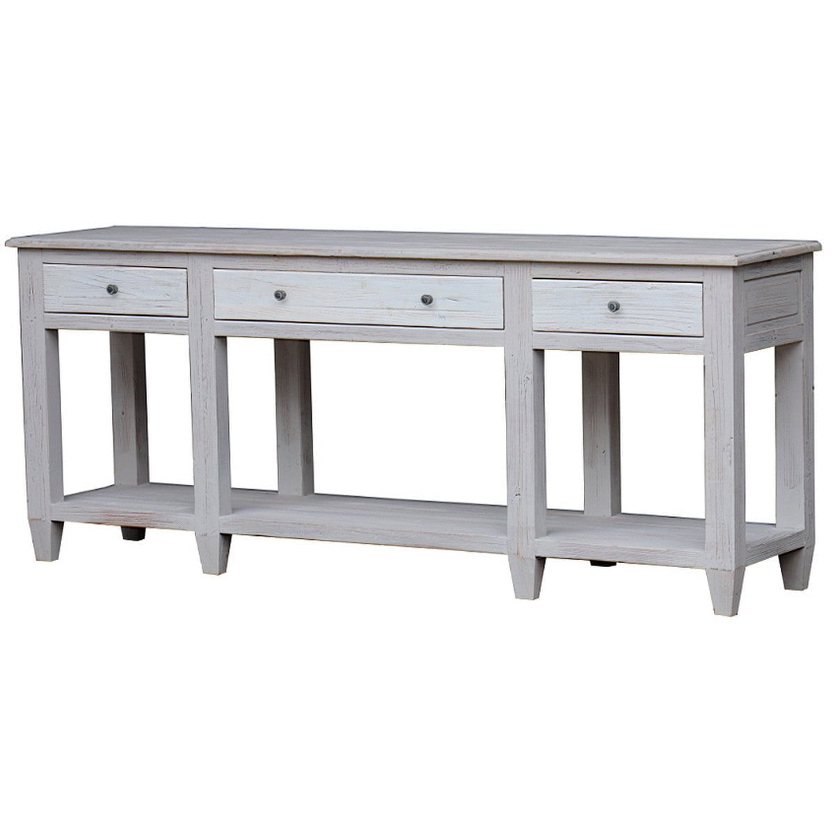 This Console Table is a stylish and practical addition to your hallway or living space. Its old pine frame and antique white finish give it a beautiful vintage look, while the three drawers provide ample storage space. Metal handles complete the look with a touch of sophistication.