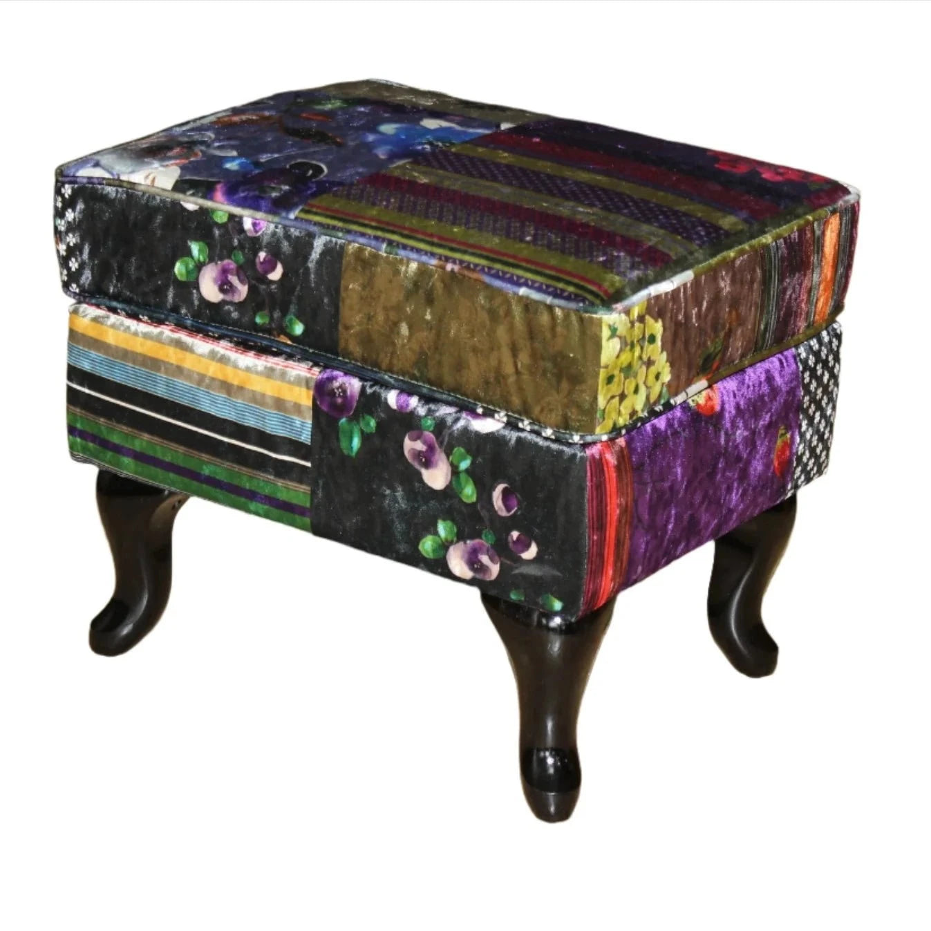 Elevate your living space with our Patchwork Ottoman. Crafted with high-quality materials including polyester velvet fabric and a strong solid wood and plywood frame structure, this ottoman offers comfort and durability. The unique patchwork design adds a touch of style to any room. Width 570 mm, Depth 460 mm, Height 490 mm. Limited stock, get yours today!