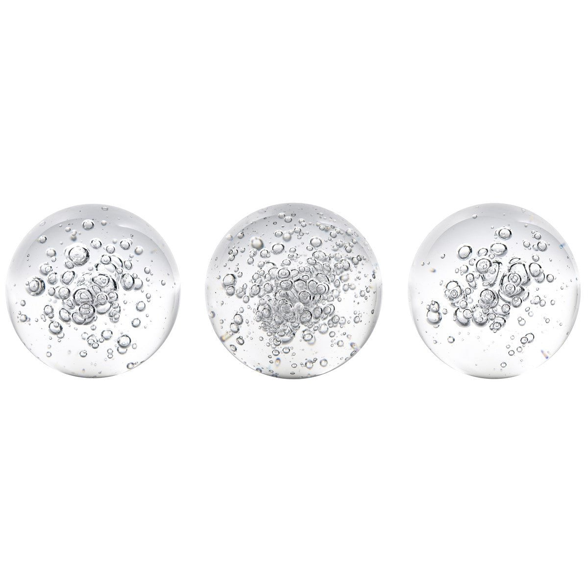 Introducing the Bubble Spheres Set of 3 - the perfect addition to your luxurious home decor. Crafted from solid polished glass, these orbs create a dramatic and unique effect, especially the Constellation sphere with its bubbled interior. Enhance the beauty of your space with these exclusive pieces.