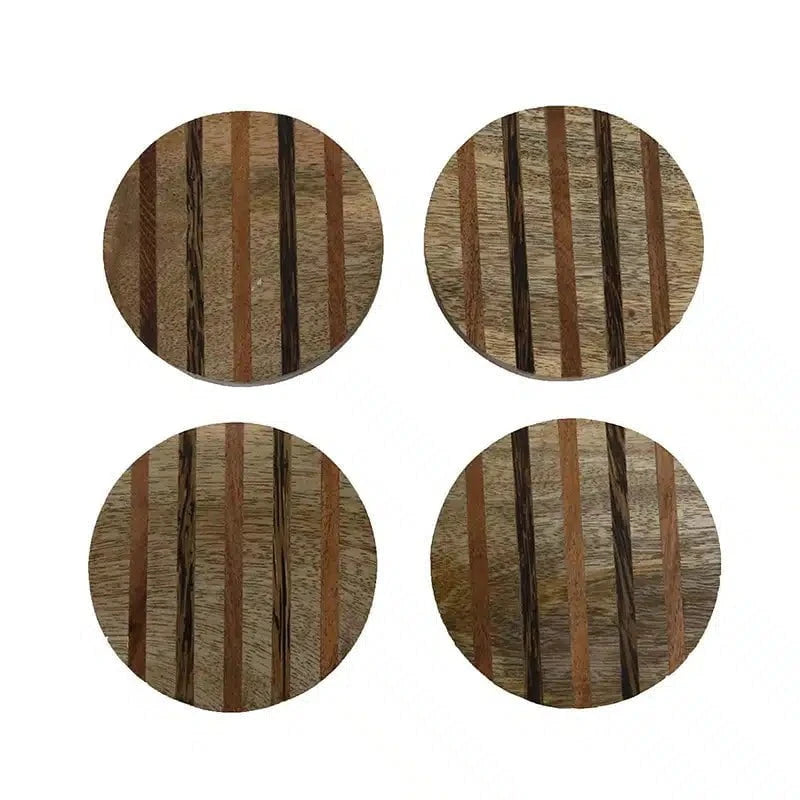 Elevate your living space with this set of four wood coasters featuring an elegant inlay design. Crafted to protect your surfaces while adding a refined touch, these coasters blend natural warmth with sophisticated style, making them perfect for both everyday use and special occasions.