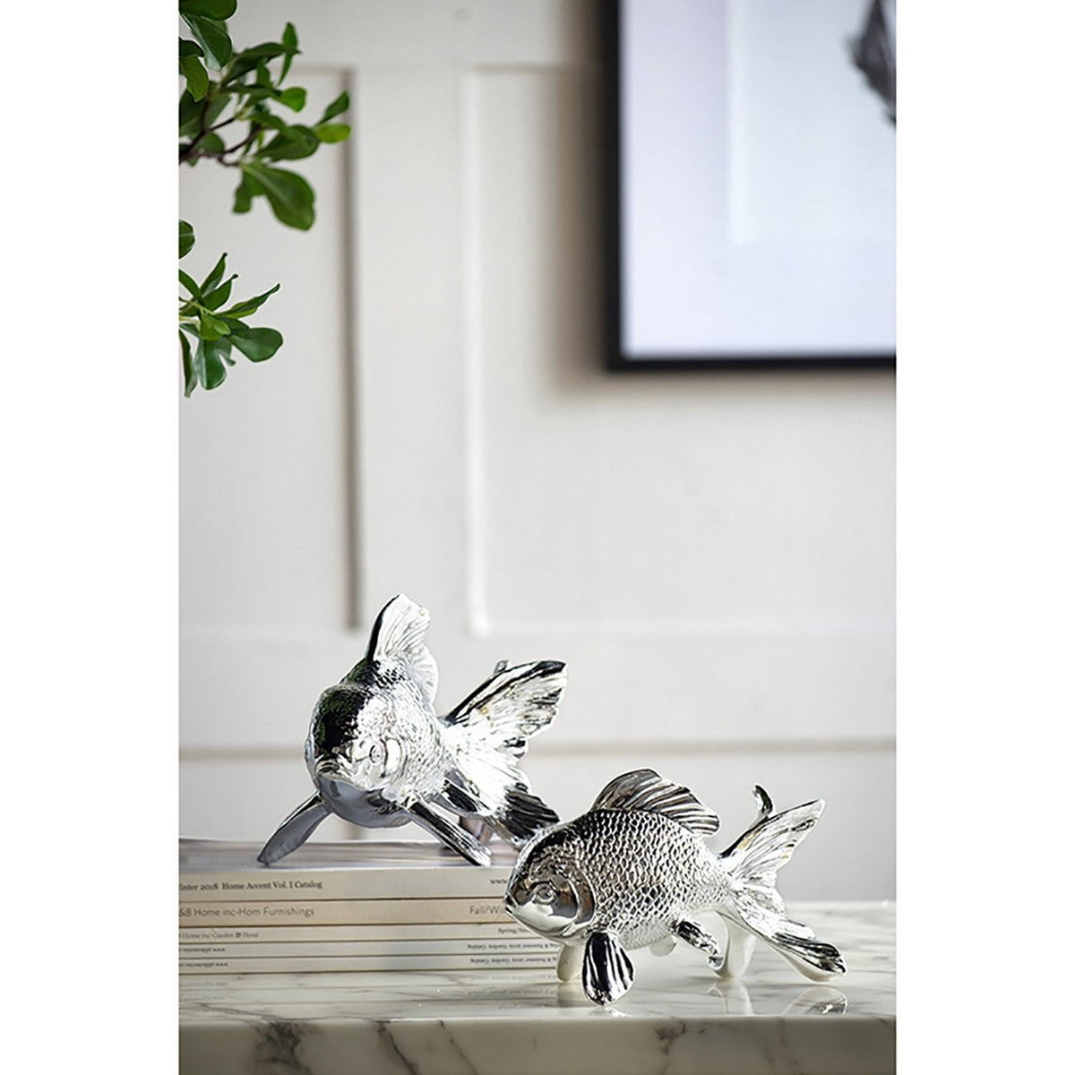 Transform your space with the glossy shine of our large RESIN FISH figurine. This chrome-finished piece adds a playful touch to any modern or ocean-inspired room. Built with durable resin and exquisite detailing, it's the perfect statement piece for a bright bathroom, airy kitchen, or chic living room.