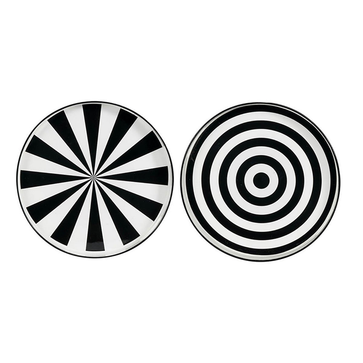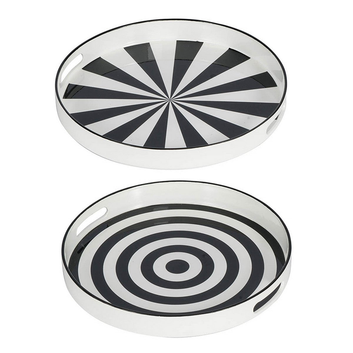 Elevate your home decor with our Round Tray S/2 - B&W. These striking black and white trays feature bold, dynamic patterns that add a touch of sophistication to any space. Use them to serve cocktails or display collectibles, making every day feel like a special occasion. Perfect for a chic kitchen or retro living room.