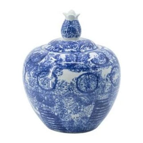 A blue and white abstract pattern lends a classic aesthetic to this jar.