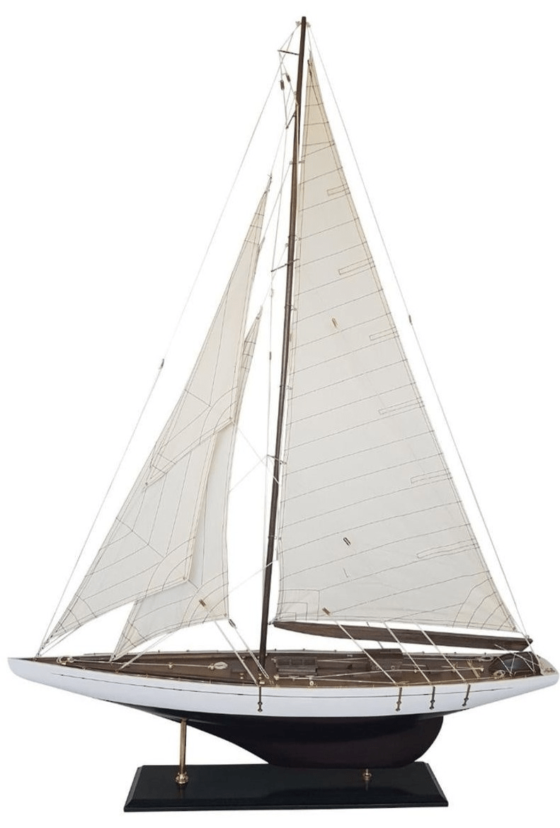 Set sail on a grand adventure with our large model sailing yacht! Hand-crafted in India with wood and fabric, this yacht boasts a stylish black, white, and natural color scheme. Perfect for display or play, indulge your love for sailing with this stunning piece.