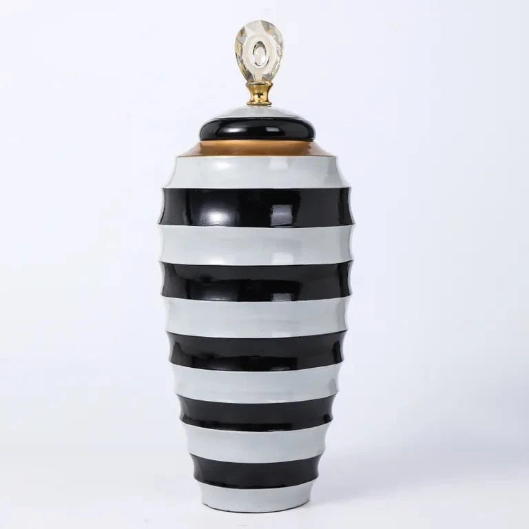 Elevate your space with the Monoluxe Lidded Vase - Large, a striking blend of modernist and glam design. Inspired by the classic Chinese ginger jar, this ceramic vase features a sleek black and white palette highlighted by elegant gold-toned accents. Its glossy glaze and sophisticated shape add a luxurious touch, making it the perfect statement piece for any home or office.