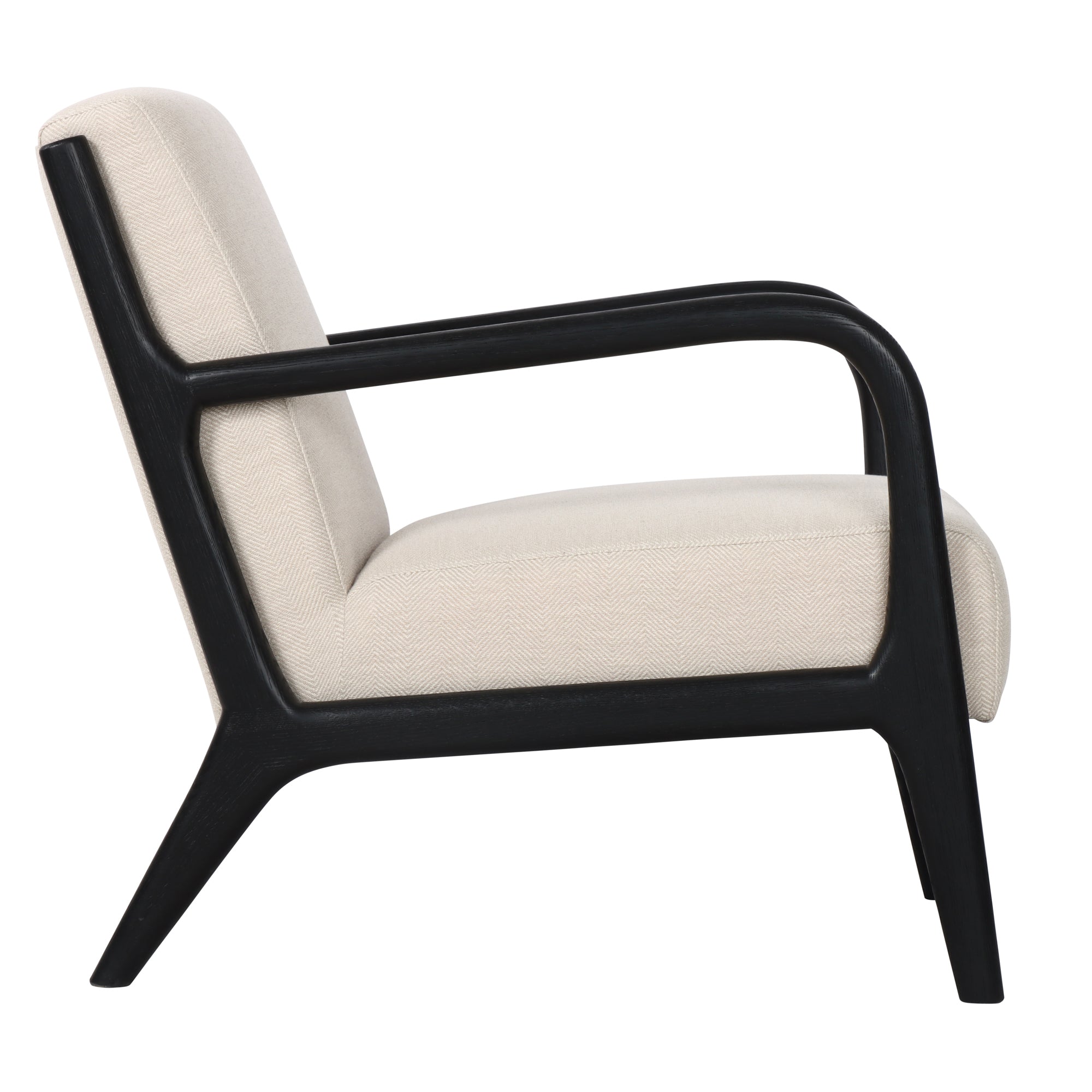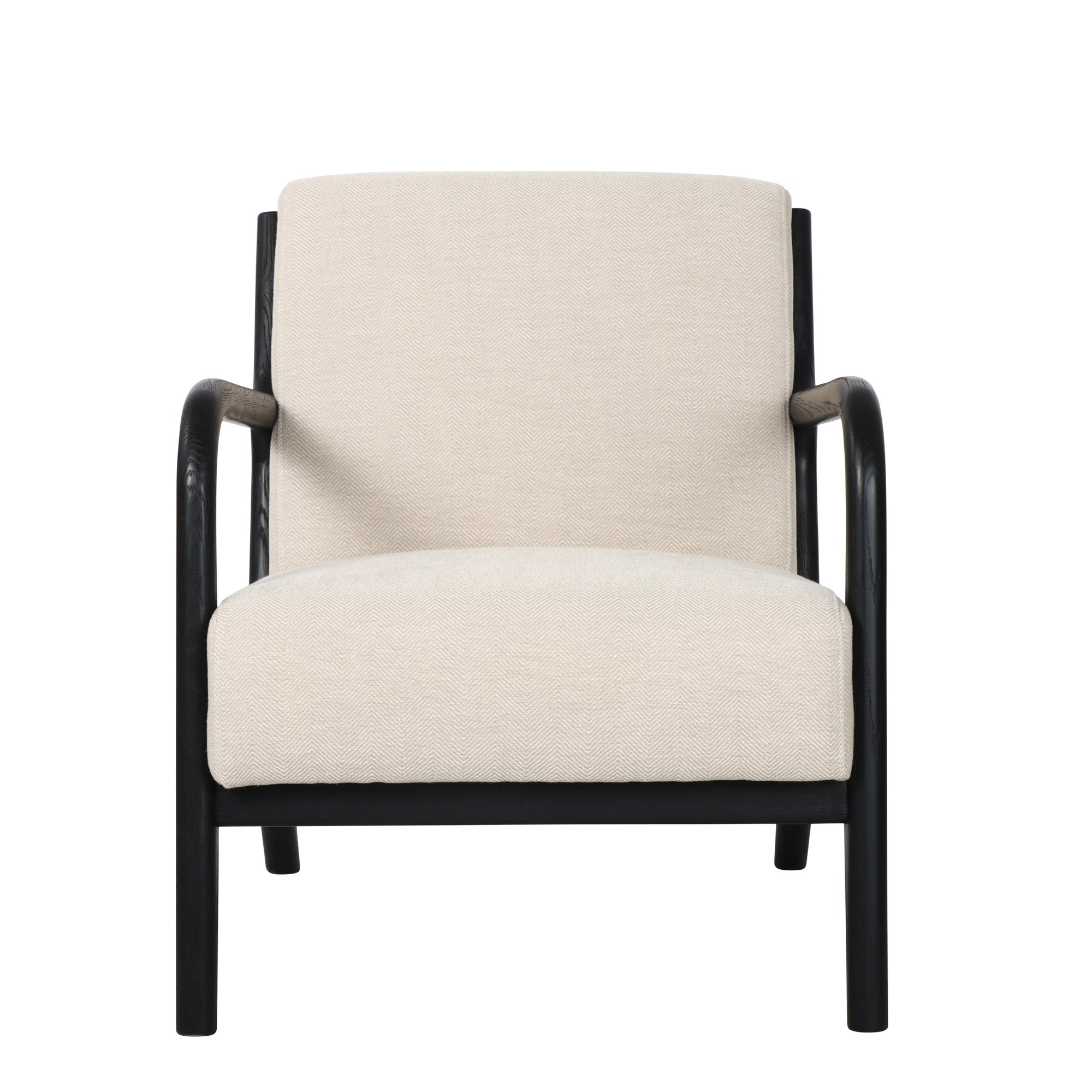 Envelop yourself in refined comfort with the Renfrow Herringbone Cream Armchair. Masterfully crafted with premium Black Oak frame and luxurious Herringbone Cream polyester upholstery, this sophisticated seating solution marries timeless design with exceptional durability. The elegant contrast between the rich wood and textured fabric creates a statement piece that elevates any interior aesthetic.