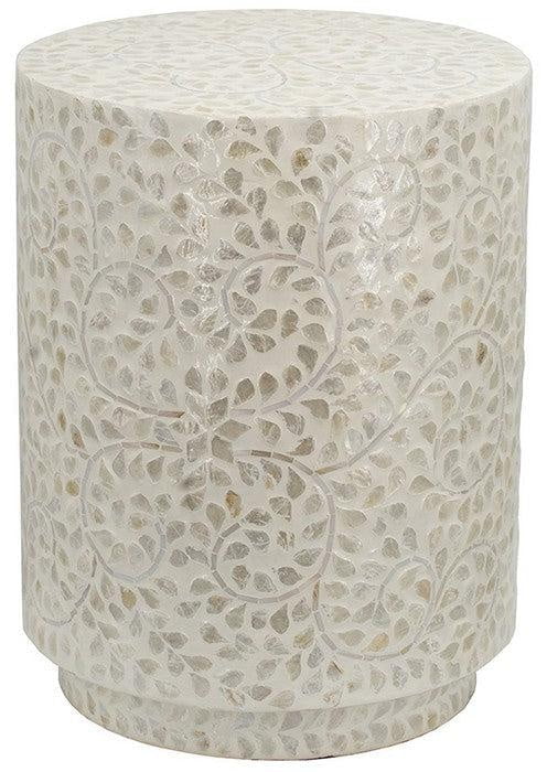 This elegant round accent table showcases a sleek design enhanced by stunning Capiz accents on its white frame. Its cylindrical shape delivers a modern geometric look while making the most of available space. Versatile as both a stool and a side table, it adds a touch of style and practicality to any room.