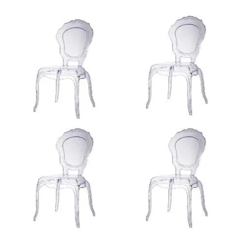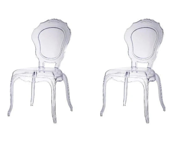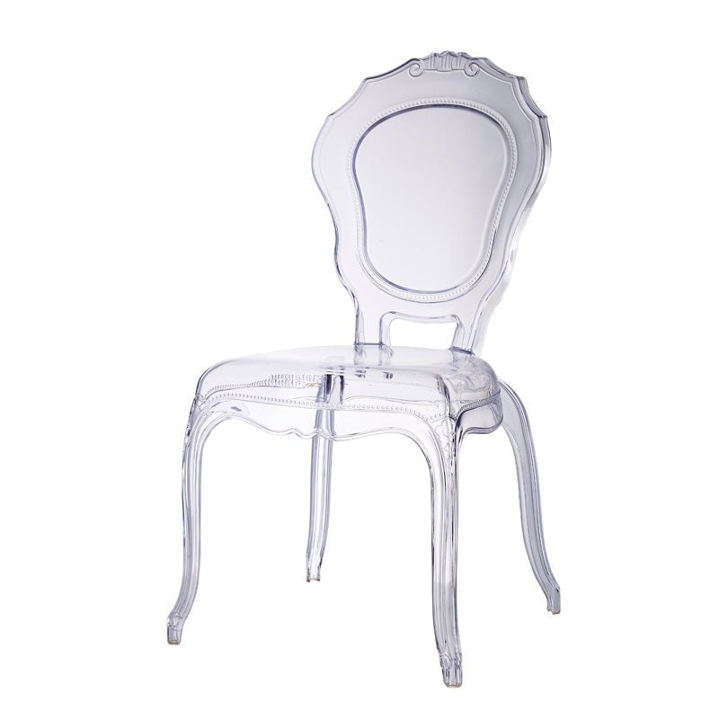 Indulge in the transparent elegance of the Clear Louis Dining Chair. Made of durable polycarbonate, this chair not only adds a modern touch to any dining space but is also stackable for easy storage. Its clear color allows it to blend seamlessly with any decor, making it a versatile and sophisticated choice.