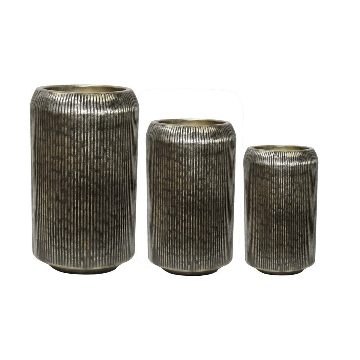 Discover a new level of sophistication with the Antique Brass Aluminium Planter S/3 Set. Crafted with meticulous attention to detail using high-quality aluminium, these exquisite planters add a touch of timeless elegance with their rich, warm antique brass coloring. Bring a sense of classic charm to any space and experience the captivating beauty of these durable and lustrous planters!