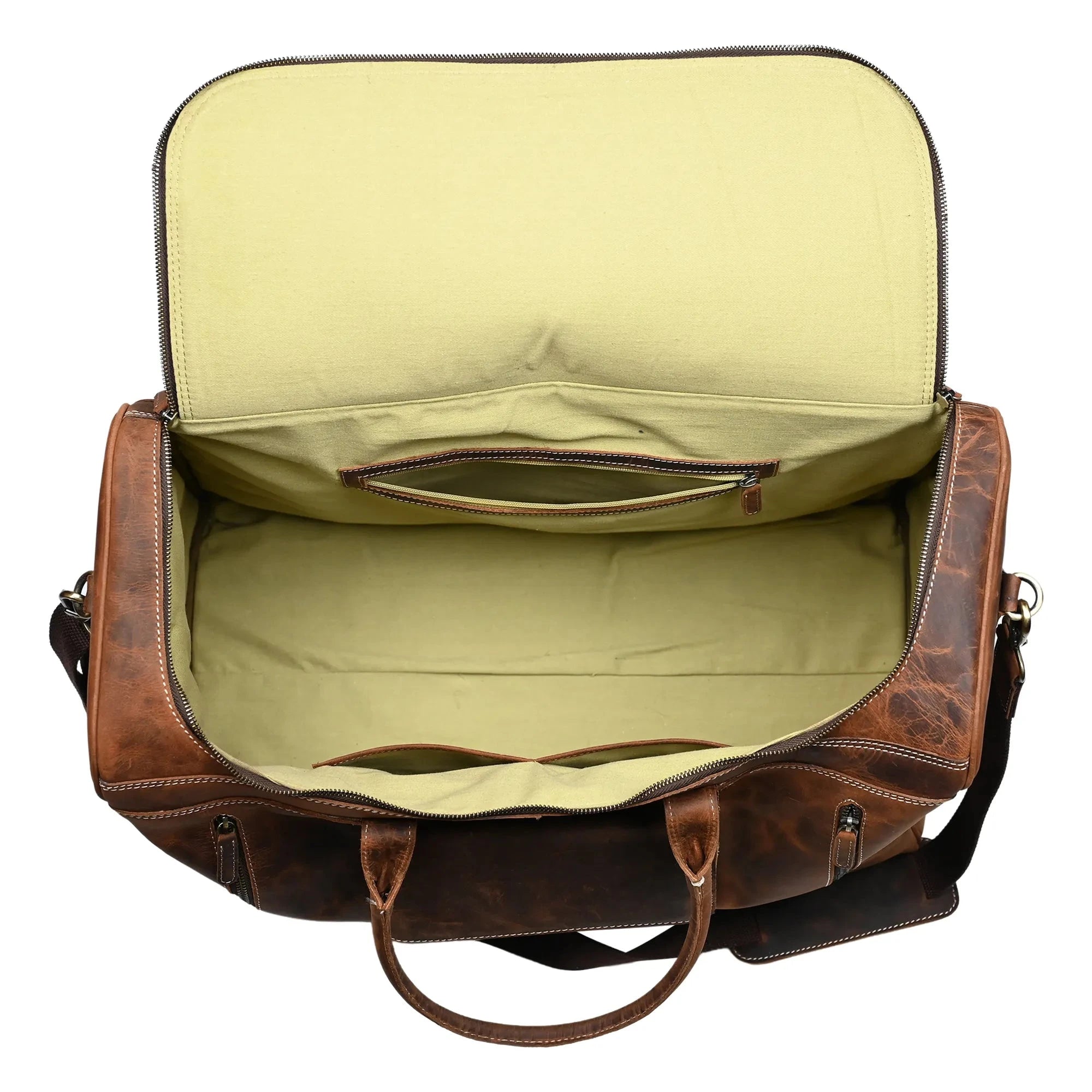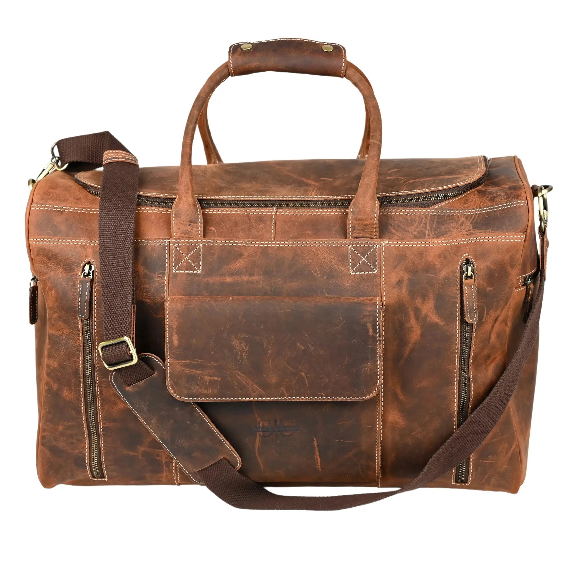 The main compartment of this duffle bag secures with a zipper and houses an interior zipped pocket alongside a slit pocket. The front features two zip pockets and a flap pocket, while the back includes an additional zip pocket. Each side gusset is equipped with a zip pocket. An adjustable cotton shoulder strap with a leather pad ensures superior comfort.
