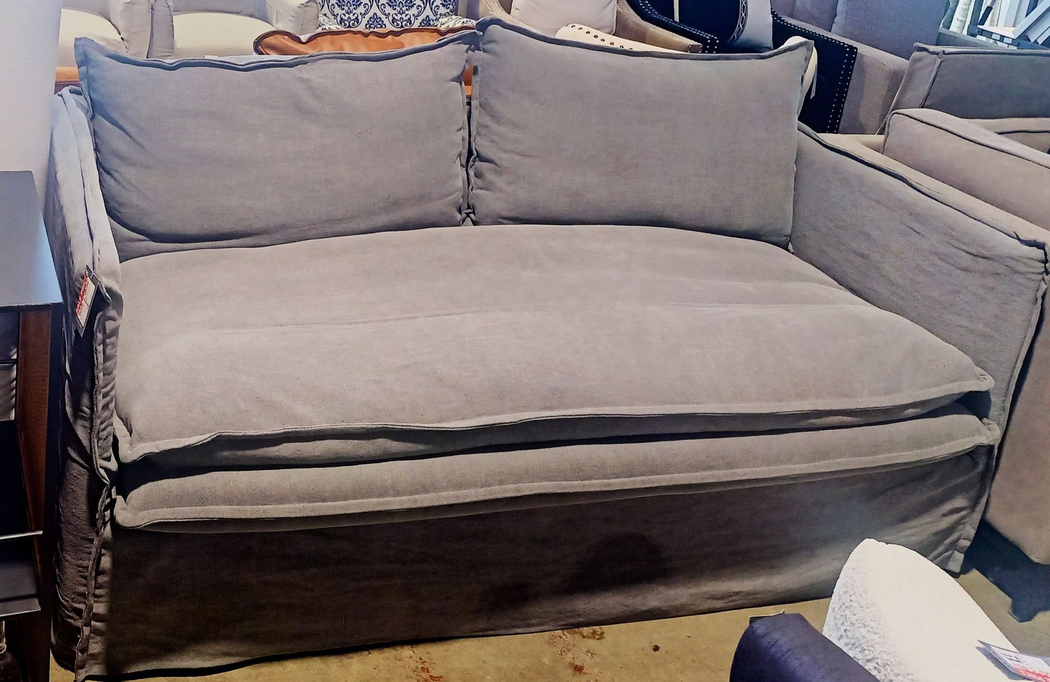 The Courtenay 2 Seat Sofa is the perfect addition to any living space. Enjoy an ultra-plush sit with a feather foam seat and cushion, all wrapped in a modern grey slip cover. Enjoy a comfortable and inviting seating experience.