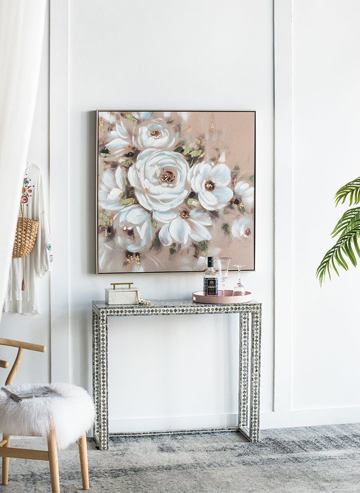 Indulge in the timeless beauty of our hand-painted white flower painting on a natural background, elegantly enhanced by a glamorous gold framed canvas. Elevate your space with this exquisite piece of art, creating a luxurious and sophisticated atmosphere. Transform your walls into an elegant statement with this radiant painting.