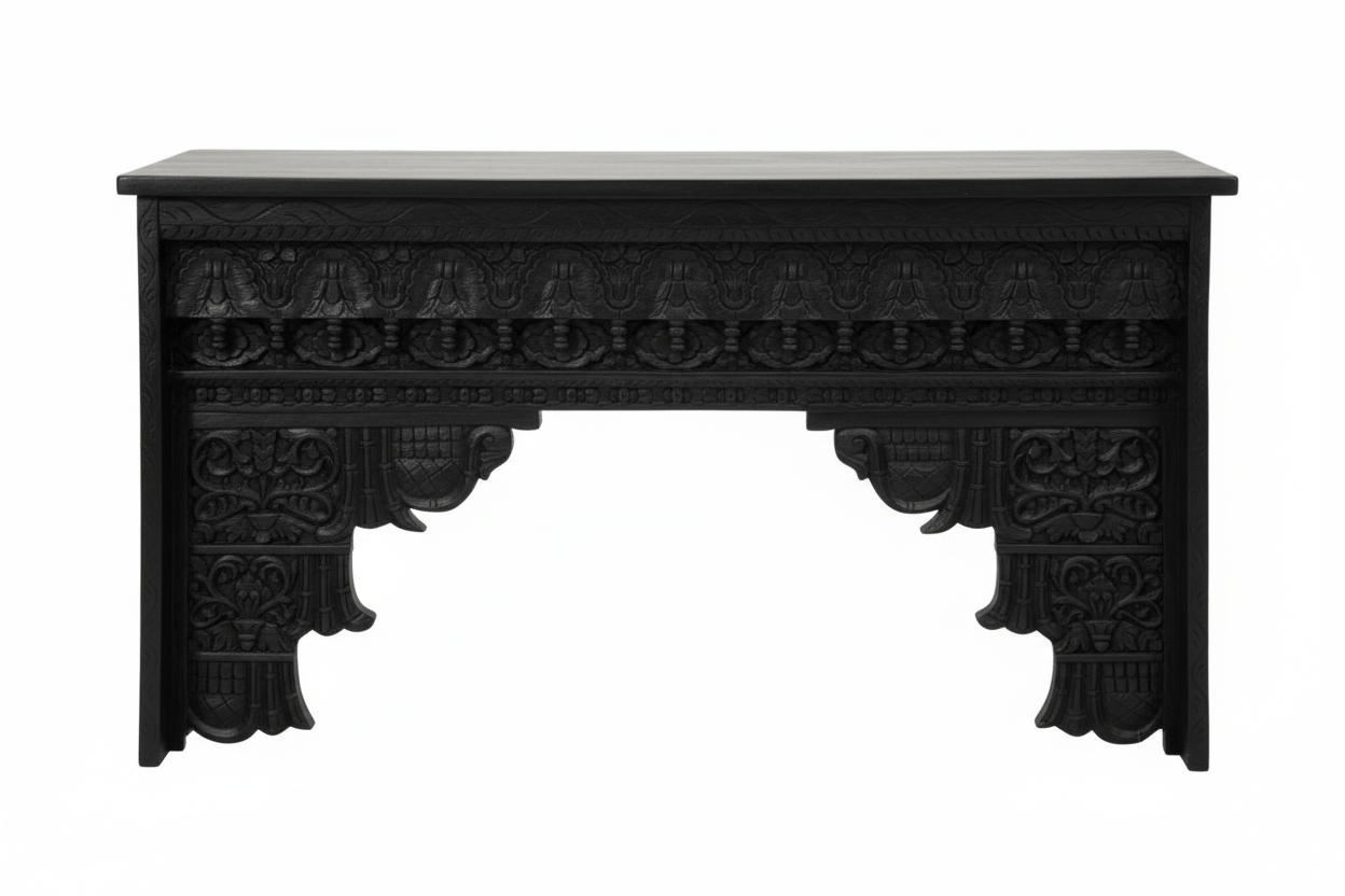 Finished in a striking matte black, this console highlights the intricate floral and geometric motifs carved into the solid Mango Wood, blending old-world charm with contemporary boldness.