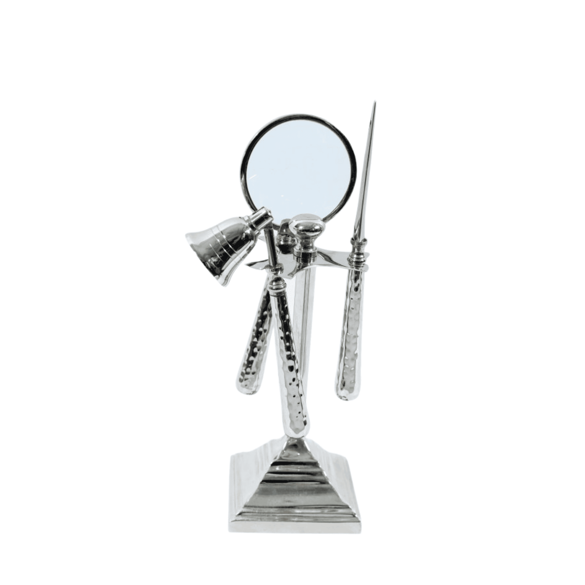 Elevate your décor and daily tasks with the Prestige Silver Magnifying Glass, Letter Opener, and Candle Snuffer Set. Made with aluminium & nickel, this set offers a precision magnifying glass, sleek letter opener, and classic candle snuffer. With a beautifully designed stand, it adds a touch of luxury to any space and makes a perfect gift.