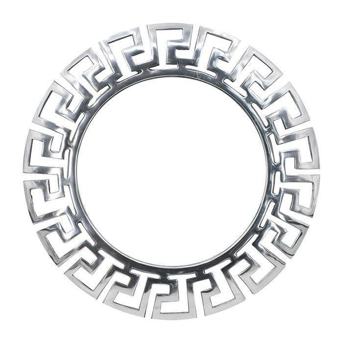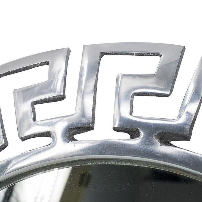 This aluminum cut out mirror is finished in a nickel tone on aluminum with a Greek-style cutaway motif.