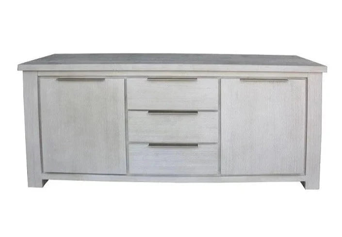 Introducing the Amanda Buffet Table, handcrafted with solid pine and finished in a luxurious white wash. With two doors and three drawers on smooth metal runners, this timeless piece offers ample storage space. Perfect for any elegant dining space, with a middle shelf behind each door for added convenience.