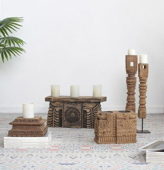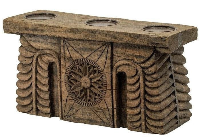 This antique Style carved 3 pillar candle holder is a carved wooden stand in a black finish that lends a cool vintage feel to any tabletop.